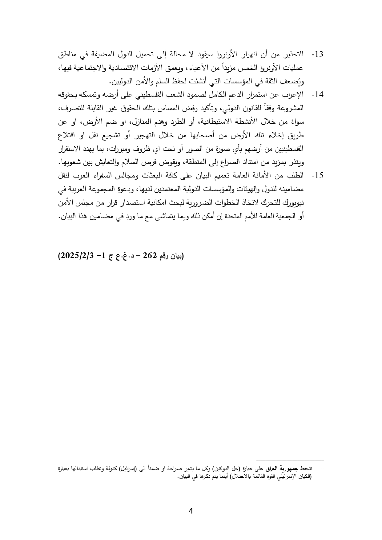 وحذر البيان من أن انهيار الأونروا سيقود لا محالة إلى تحميل الدول المضيفة في مناطق عمليات الأونروا الخمس مزيداً من الأعباء، ويعمق الأزمات الاقتصادية والاجتماعية فيها، ويُضعف الثقة في المؤسسات التي أنشئت لحفظ السلم والأمن الدوليين.