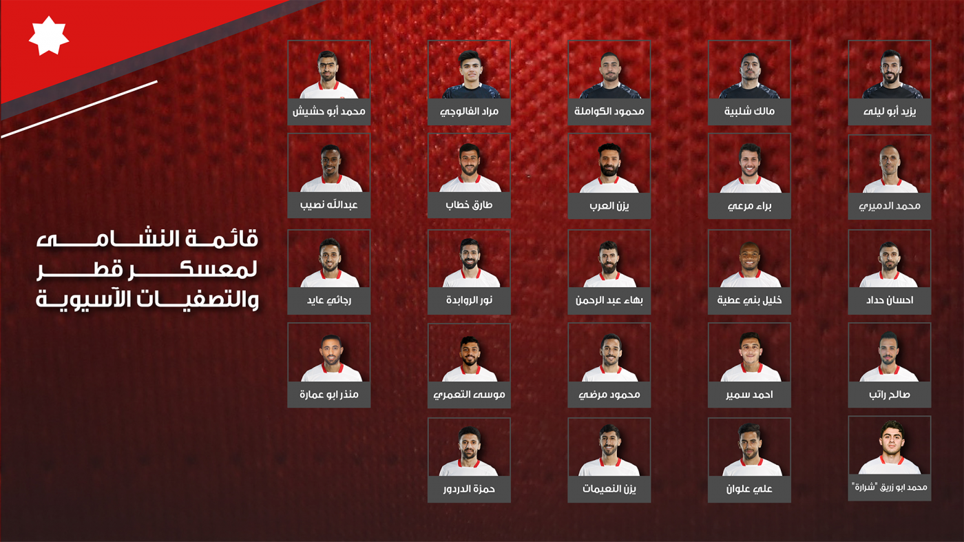 وضمت القائمة: يزيد أبو ليلى، مالك شلبية، محمود الكواملة، مراد الفالوجي، محمد أبو حشيش، محمد الدميري، براء مرعي، يزن العرب، طارق خطاب، عبد الله نصيب، إحسان حداد، خليل بني عطية، بهاء عبد الرحمن، نور الروابدة، رجائي عايد، صالح راتب، أحمد سمير، محمود مرضي، موسى التعمري، منذر أبو عمارة، محمد أبو زريق “شرارة”، علي علوان، يزن النعيمات، وحمزة الدردور.