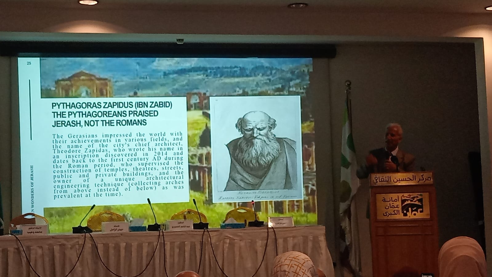 وتناول الدكتور محمد وهيب أهمية التوازن بين الدين والروح في بناء الحضارات، مشيراً إلى مكانة جرش التاريخية ودورها في العصر الروماني كمحطة للقوافل التجارية وموطن لمهندسين وعلماء بارزين مثل زابيدوس ونيكوماكوس، وقدم شرحا مفصلا و عرضاً تقديمياً حول استخدام الذكاء الاصطناعي في إعادة بناء مدينة جرش افتراضياً وإدماجها في العالم الافتراضي والألعاب التعليمية الإلكترونية، بهدف تعريف الأطفال بالحضارات القديمة وتاريخ مدينتهم، وإمكانية الاستفادة من الترويج لهذا الإرث الثقافي التاريخي العظيم لمدينة جرش، وتشجيع السياحة والثقافة معا.
