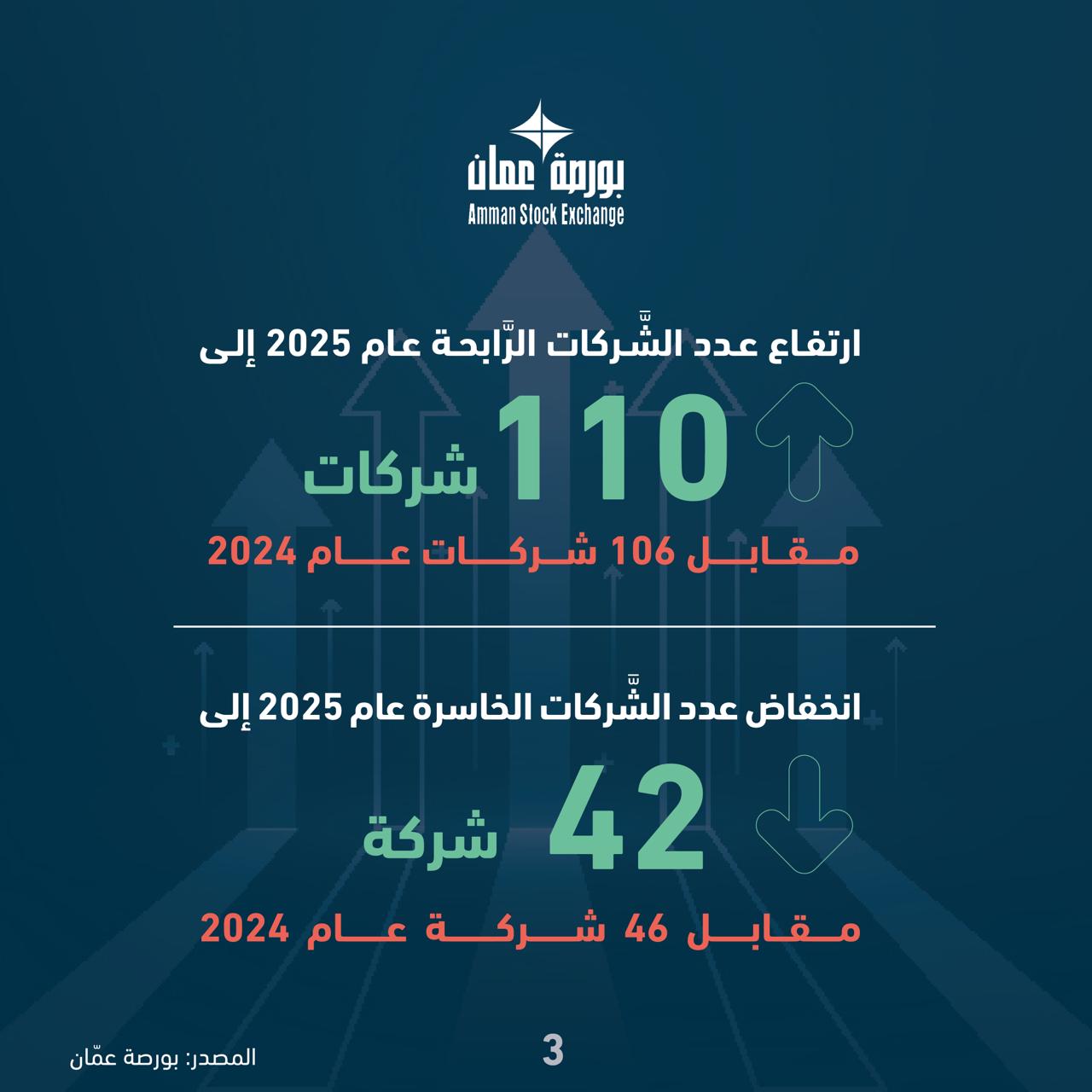 كما ارتفع عدد الشركات الرابحة عام 2025 إلى 110 شركات مقابل 106 شركات عام 2024، وفي المقابل انخفض عدد الشركات الخاسرة عام 2025 إلى 42 مقابل 46 شركة عام 2024.