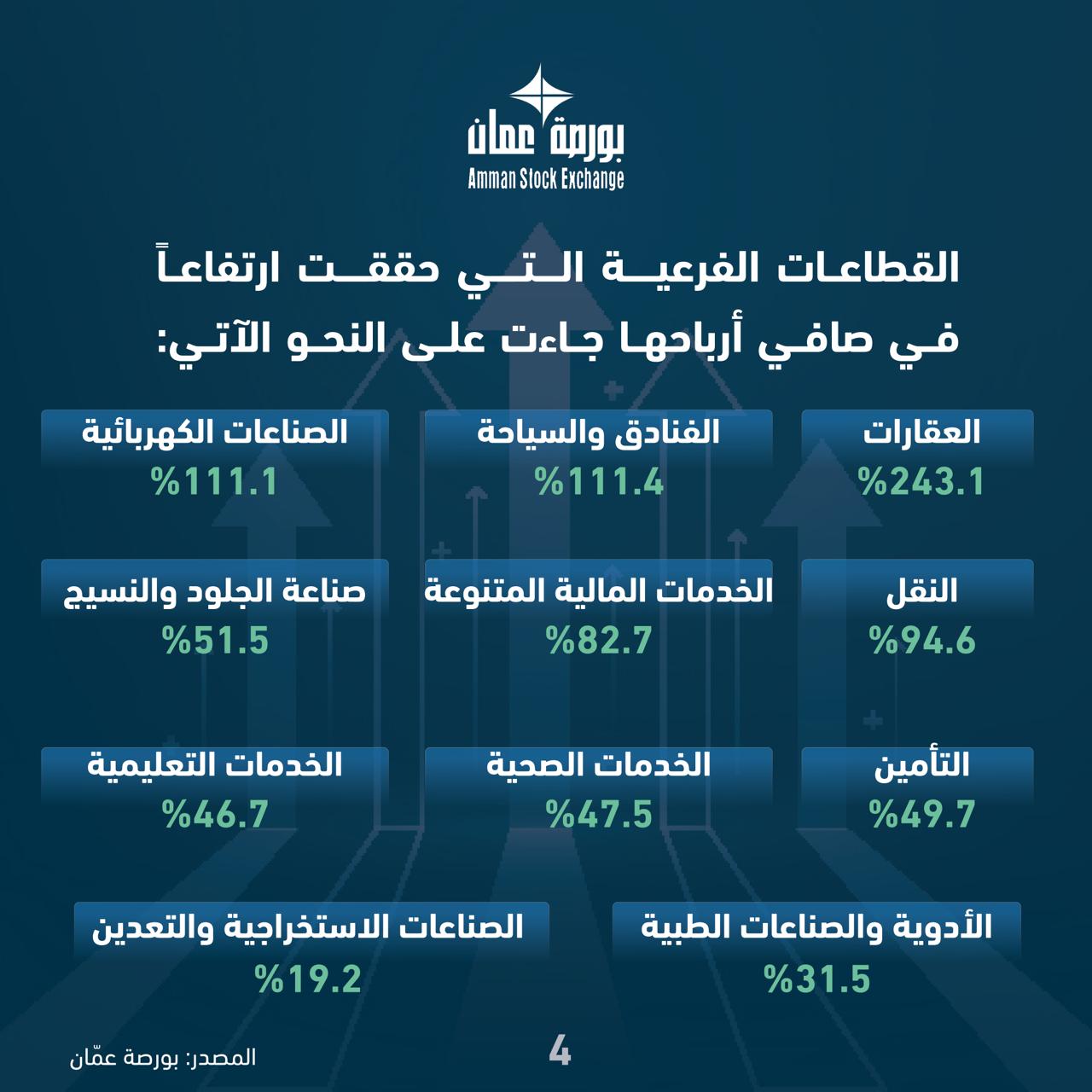 أما القطاعات الفرعية التي حققت ارتفاعاً في صافي أرباحها فجاءت على النحو الآتي: العقارات بنسبة 243.1 بالمئة، والفنادق والسياحة 111.4 بالمئة، والصناعات الكهربائية 111.1 بالمئة، والنقل 94.6 بالمئة، والخدمات المالية المتنوعة 82.7 بالمئة، وصناعة الجلود والنسيج 51.5 بالمئة، والتأمين 49.7 بالمئة، والخدمات الصحية 47.5 بالمئة، والخدمات التعليمية 46.7 بالمئة، والأدوية والصناعات الطبية 31.5 بالمئة، والصناعات الاستخراجية والتعدين 19.2 بالمئة.