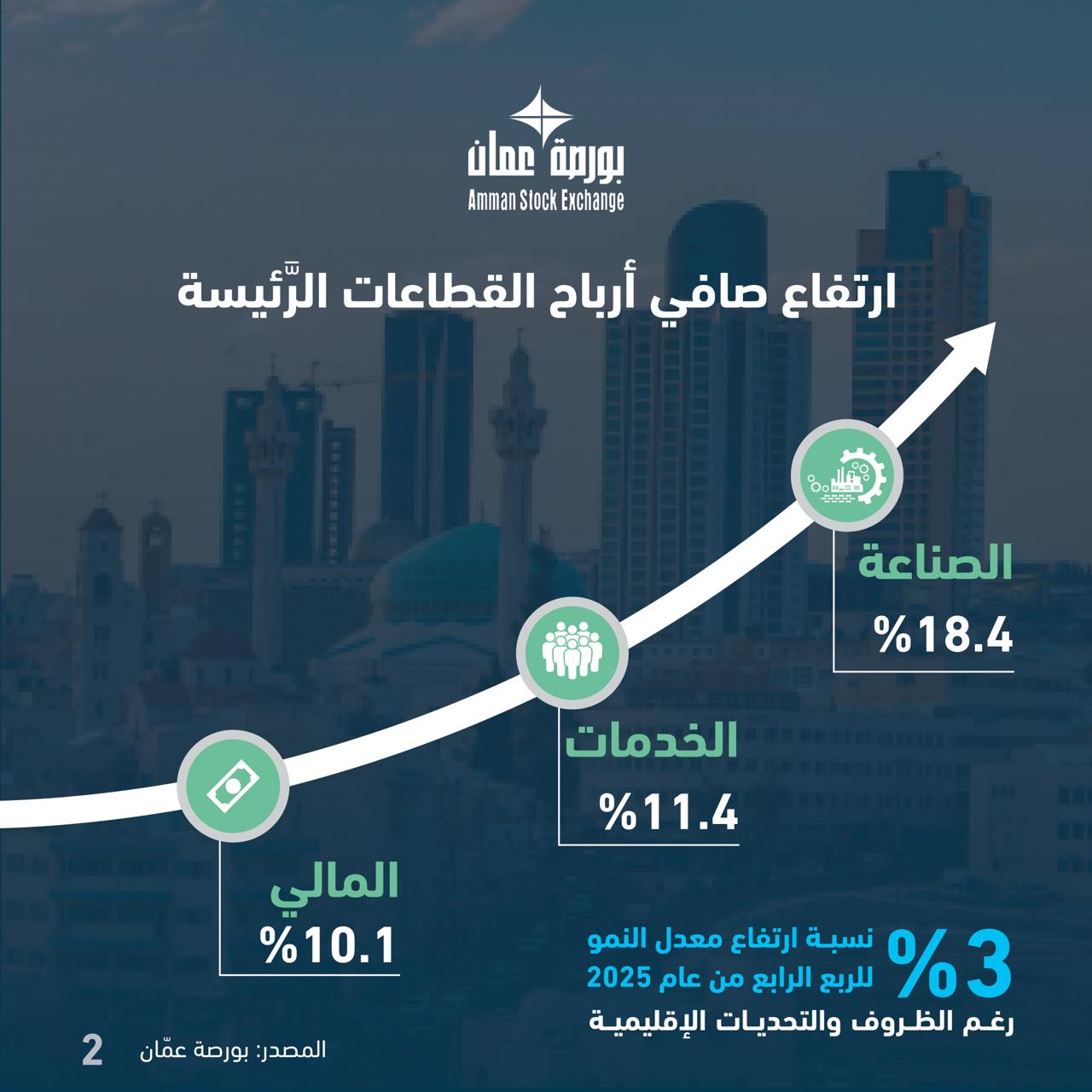 وتأتي هذه النتائج الإيجابية التي حققتها تلك الشركات، والارتفاع في صافي أرباحها المتحققة لعام 2025 رغم الظروف والتحديات الإقليمية، ما يشير إلى المسار الإيجابي التصاعدي للاقتصاد الوطني ومتانته، وتحسّن بيئة الاستثمار بشكل واضح في ظلّ القرارات الحكومية التحفيزية للقطاعات الاقتصادية، الأمر الذي أدّى إلى ارتفاع معدل النمو للربع الرابع من عام 2025 إلى 3 بالمئة، وقيادة عدد من القطاعات الإنتاجية للنموّ؛ كقطاع الزراعة والتعدين والصناعات التحويلية.