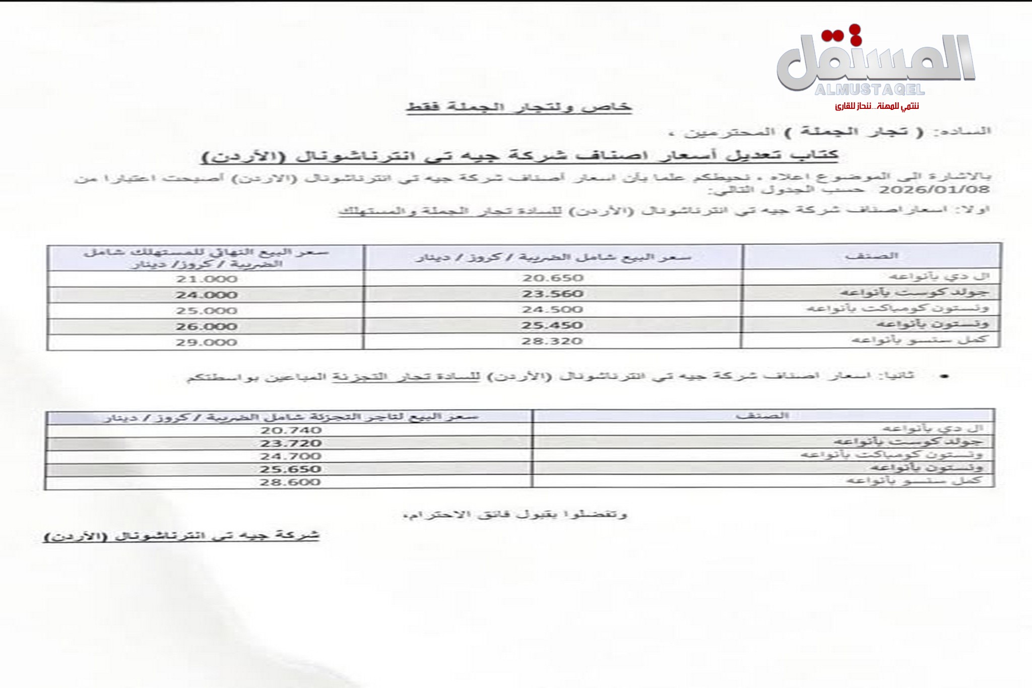 المستقل – أعلنت شركات تبغ وسجائر في الأردن زيادة في أسعار مجموعة جديدة ومتنوعة من أنواع الدخان، اعتبارا من يوم غد الخميس.