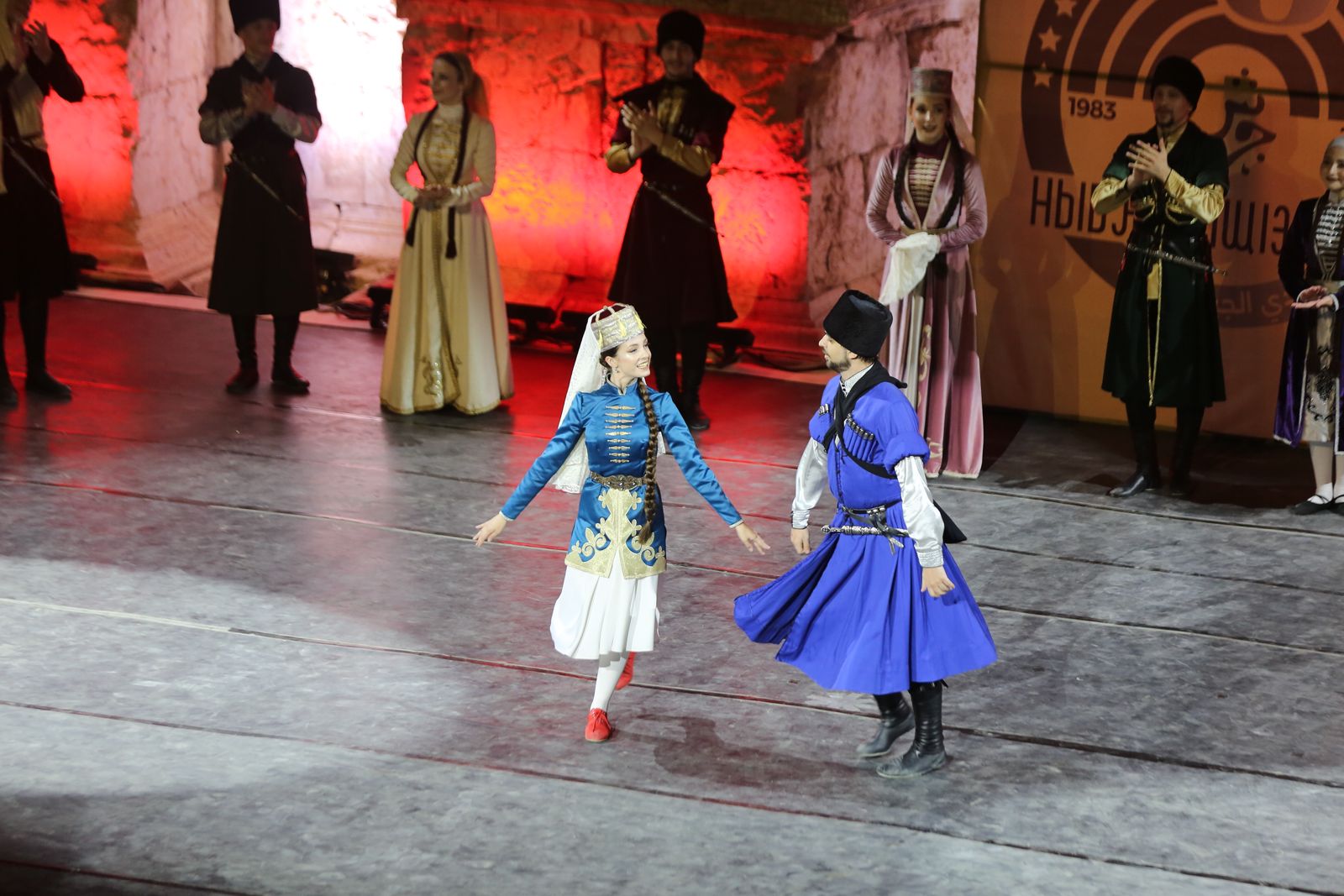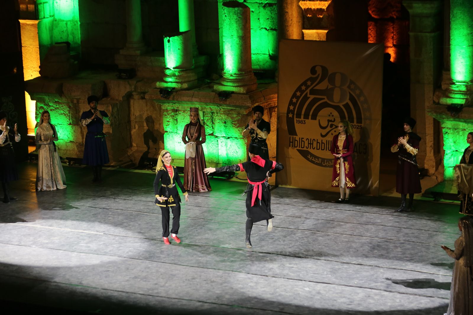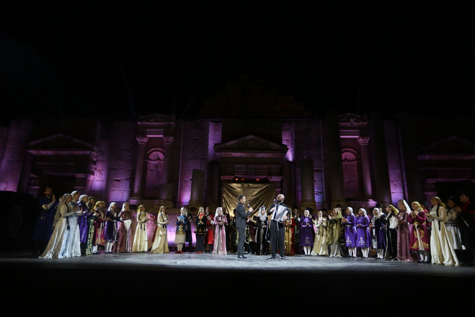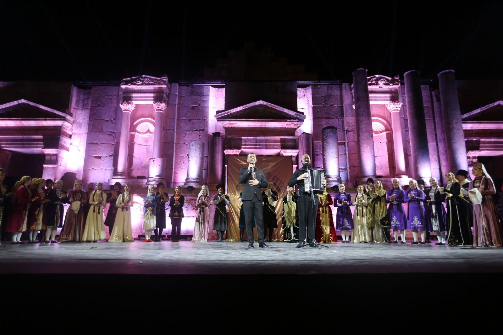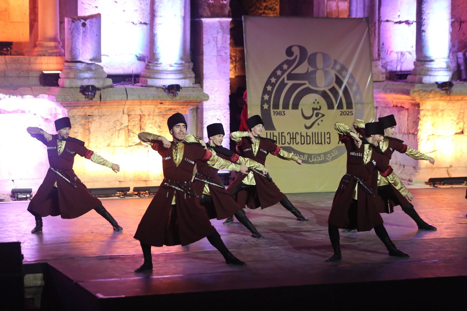 قال عريف الحفل : نلتقي اليوم في جرش… حيثُ لا يكون اللقاءُ مجرّدَ عرض، بل صدى لذاكرةٍ حَمَلَتها القلوبُ من القفقاس، ونسجتها الأرواح حبًّا على أرض الأردن، فامتزجت الجذورُ بالمكان، واستقرت في قلوب الناس، لتكون فرقةُ الجيل الجديد ترجمةً حيةً لإرثٍ خالد يعيش في الوجدان، ولحناً يَستمر في سردِ المسيرة..