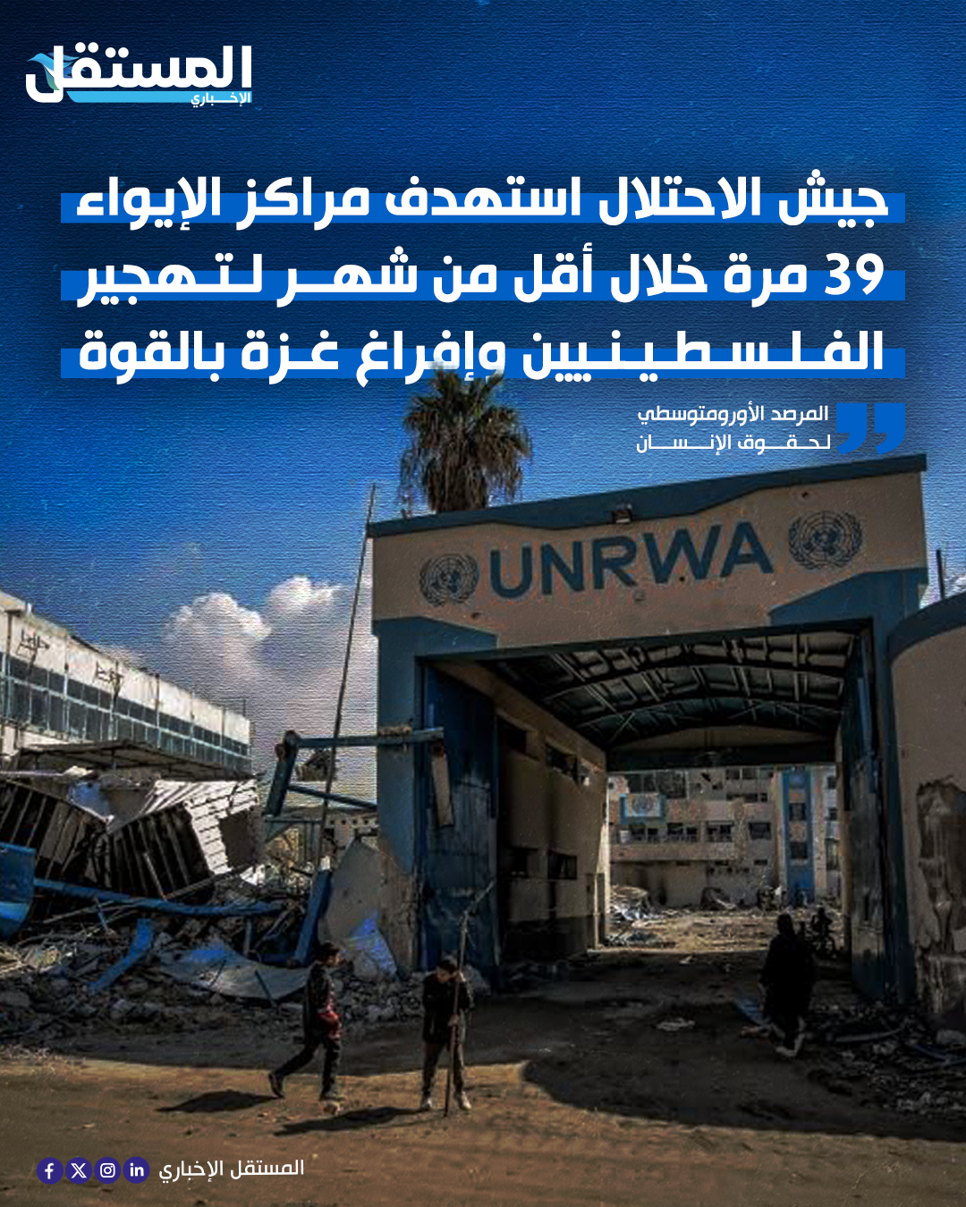 وأشار المرصد الأورومتوسطي إلى أن سياسة إسرائيل الممنهجة في تدمير مراكز الإيواء تؤدي إلى تشديد الخناق أكثر على الخيارات المتاحة للسكان فيما يخص الأماكن التي يمكن اللجوء إليها، مما يسهل تحقيق أهداف إسرائيل المتمثلة في تدمير الفلسطينيين وتهجيرهم بالقوة وتغيير التركيبة السكانية في القطاع، وخاصة في شمال غزة، في الوقت الذي أعربت فيه مستويات رسمية إسرائيلية مختلفة عن نيتها صراحة بضمه والاستيطان فيه.