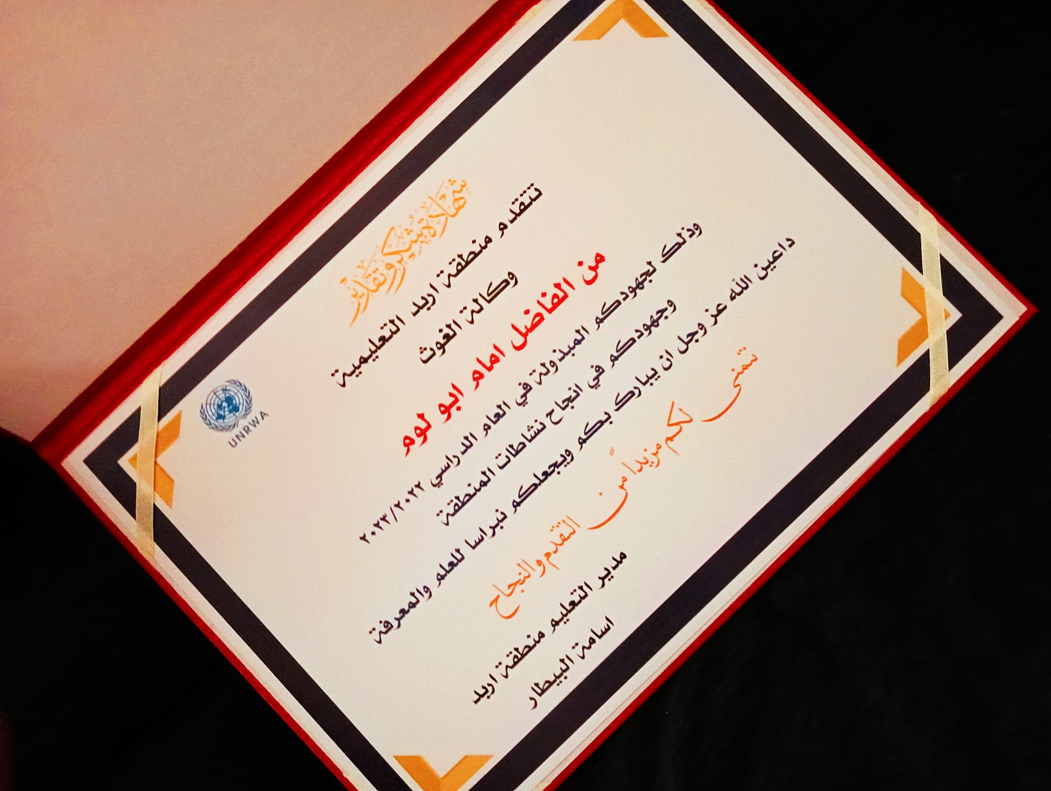 المستقل – كرمت وكالة الغوث لمنطقة اربد التعليمية المعلم أمام رياض الطوافشة ، بشهادة شكر وتقدير ، وذلك لجهوده المبذولة في العام الدراسي 2022/2023 في انجاح نشاطات المنطقة التعليمية متمنين له المزيد من التقدم والنجاح .