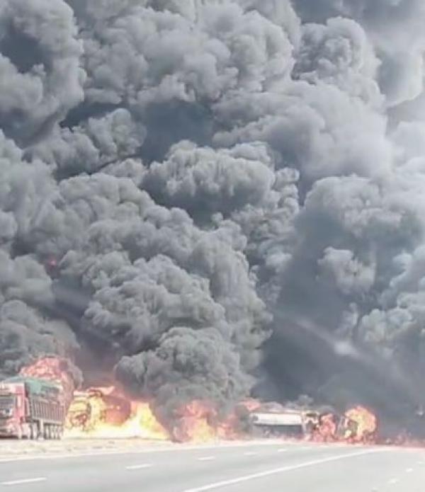 وأظهرت مقاطع فيديو اشتعال الصهريج بعد تدهوره.