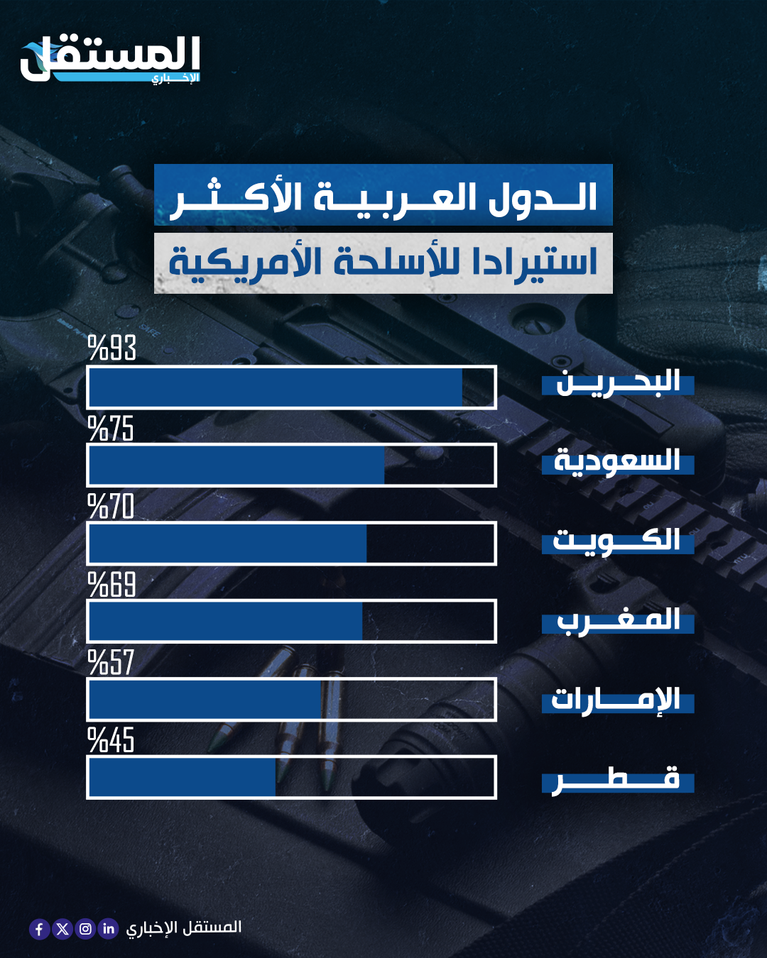 وكانت ثلاث دول عربية من بين أكبر 10 متلقين للأسلحة الأمريكية في الفترة ما بين 2019 و2023: إذ استحوذت السعودية على 15٪ من صادرات الأسلحة الأمريكية، وقطر على 8.2 ٪، والكويت على 4.5٪.