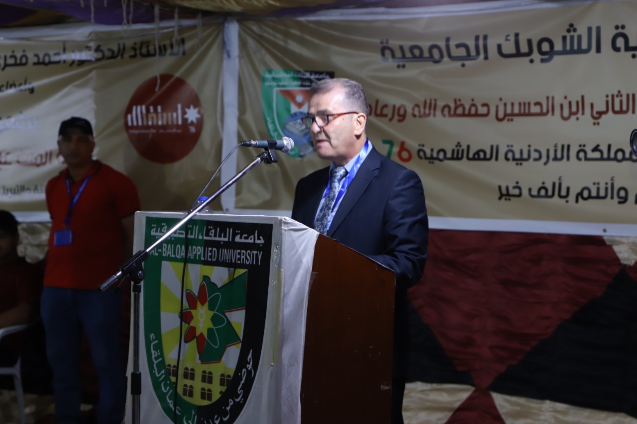 مندوب راعي الحفل الاستاذ الدكتور ناصر الكلوب قال في كلمته ان هذا الاحتفال الذي يقام بالتعاون مع كل من سلطة إقليم البتراء التنموي السياحي ومديرية شباب معان هو باكورة احتفالات الجامعة بعيد الاستقلال، وبهذه المناسبة ترفع أسرة جامعة البلقاء التطبيقية أسمى آيات التهاني والتبريك إلى مقام حضرة صاحب الجلالة الملك عبدالله الثاني ابن الحسين المعظم حفظه الله ورعاه، وإلى ولي عهده الأمين سمو الأمير الحسين بن عبدالله المعظم حفظه الله ورعاه، وإلى الشعب الأردني العظيم أسمى أيات التهنئة والتبريك،  وفي هذا العام يأتي الاستقلال السادس والسبعين، حيث يستبشر الأردنيون بالخير الذي قدم على البلاد، والنهضة التي شهدها الأردن منذ يوم الاستقلال عن الانتداب البريطاني وحتى يومنا هذا.