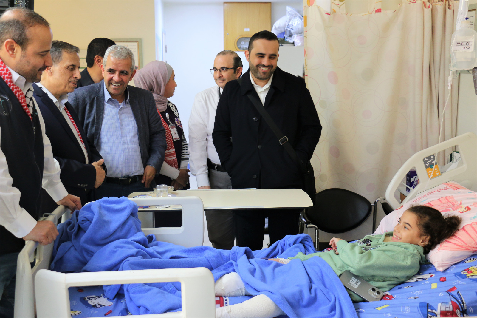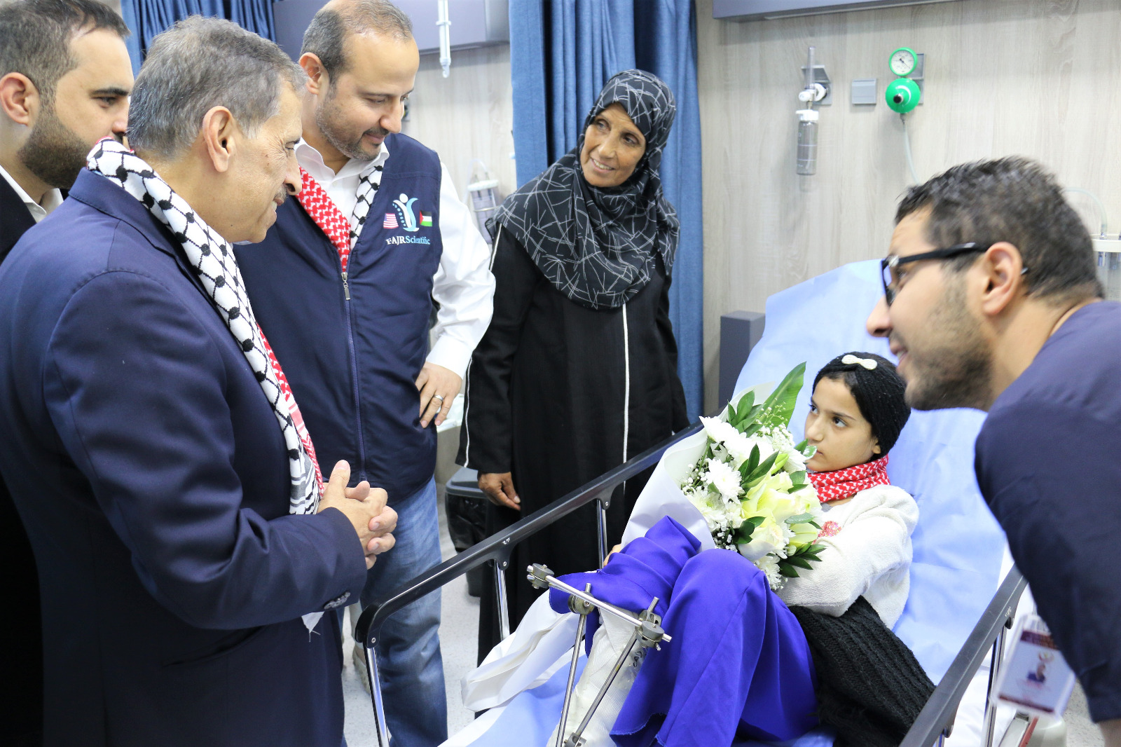 وكان في استقبالهم الدكتور فوزي الحموري مدير عام المستشفى والرئيس التنفيذي لمبادرة صحة غزة والدكتور مصعب ناصر رئيس مؤسسة فجر العلمية وعدد من المسؤولين في قناة الجزيرة حيث أعرب الحموري عن سعادته لاستقبال العطار والأطفال المصابين مشيراً إلى أن المستشفى التخصصي استقبل ايضاً مجموعة من الأطفال المصابين القادمين من غزة خلال الأيام الماضية والذين تم إجلاؤهم من قطاع غزة، وذلك بالتنسيق مع منظمة الصحة العالمية ومؤسسة فجر العلمية ، مضيفاً أن ثمة فحوصات وإجراءات وتدخلات طبية حثيثة ومستعجلة تستدعيها هذه الحالات لما تعرضت له من هجوم وحشي واستهداف مباشر وغير مباشر من قِبل جيش الاحتلال .