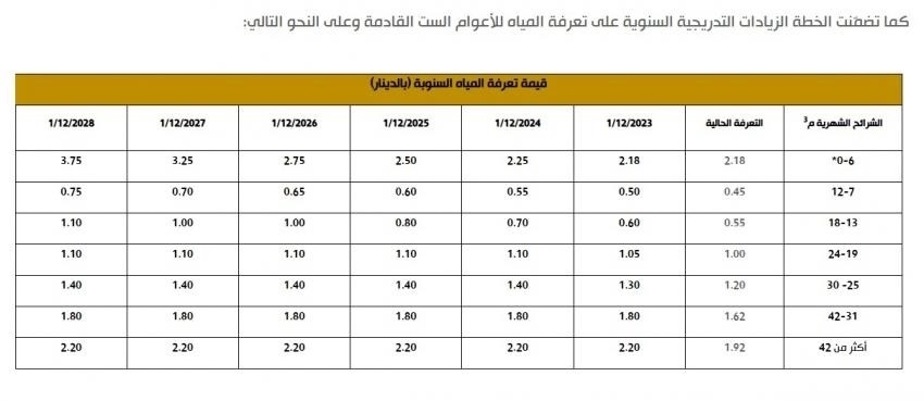 وكانت الحكومة وضعت في العام 2023 استراتيجية لرفع أسعار المياه والصرف الصحي بالتدريج حتى العام 2028، بحسب شرائح الاستهلاك، حيت تم الرفع الشهر الماضي ما سينعكس على فواتير هذا الشهر.