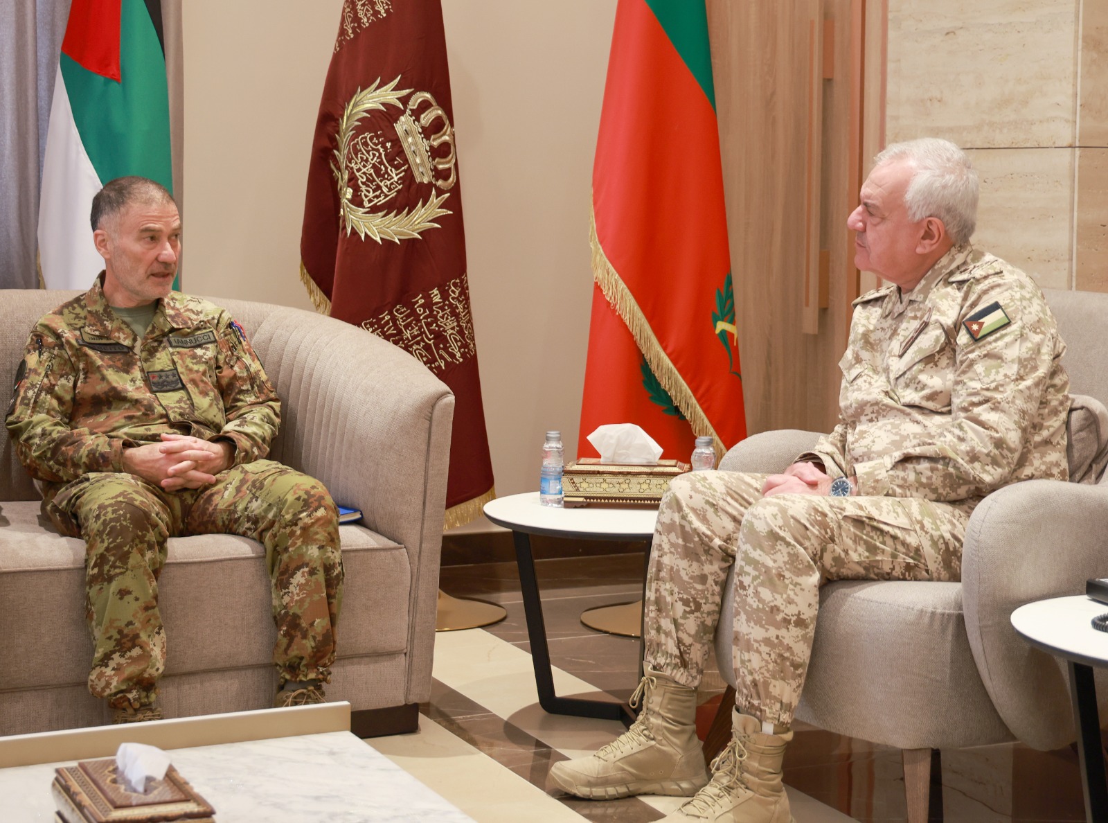 وبحث اللواء الركن الحنيطي مع الوفد الضيف، بحضور عدد من كبار ضباط القوات المسلحة الأردنية والملحق الدفاعي الإيطالي في عمان، سبل تعزيز علاقات التعاون الثنائي بما يخدم مصلحة القوات المسلحة في البلدين الصديقين، إضافة إلى مناقشة آخر التطورات على الساحتين الإقليمية والدولية، وجهود البلدين الصديقين في إرساء الأمن والاستقرار الدوليين.