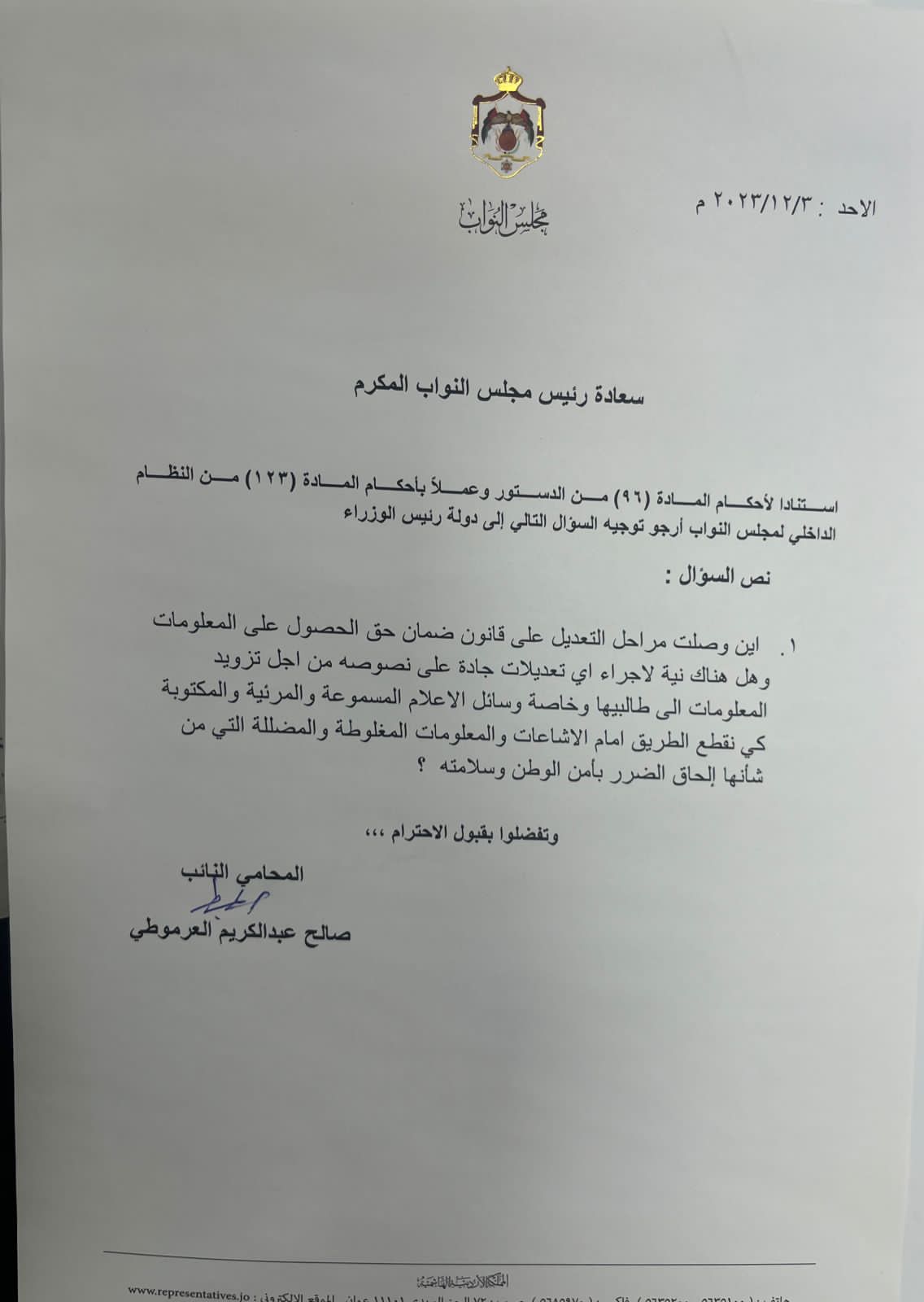 المستقل – وجه النائب المحامي صالح العرموطي سؤال نيابي الى رئيس الوزراء الدكتور بشر الخصاونة حول تسمية احد الشوارع في منطقة العبدلي .