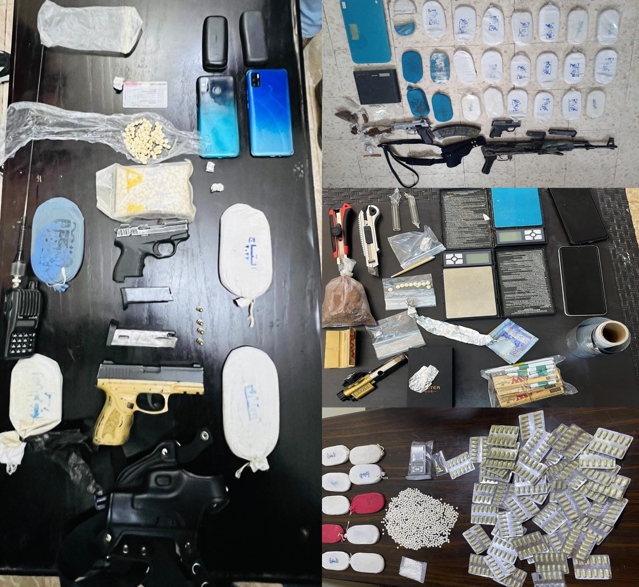 وفي محافظة البلقاء، ألقي القبض على شخصين من مروجي المخدرات في مداهمتين منفصلتين وضبط بحوزتهما كميات من المواد المخدرة المعدة للبيع وأسلحة نارية.