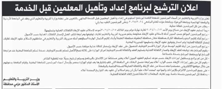الرئيسيةالمانشيتالمرشحون لبرنامج اعداد وتأهيل المعلمين (اسماء)المانشيتوظائفالمرشحون لبرنامج اعداد وتأهيل المعلمين (اسماء)الأحد أكتوبر 13 ,24شاركFacebookTwitterPinterestWhatsApp المرشحون لبرنامج اعداد وتأهيل المعلمين (اسماء)المستقل – اعلنت وزارة التربية والتعليم اسماء المرشحين لبرنامج الدبلوم في اعداد وتأهيل المعلمين قبل الخدمة المنتهي بالتعيين .وتالياً الاسماء : شاركFacebookTwitterPinterestWhatsApp المادة السابقةمدعوون لاجراء المقابلات الشخصية في وزارةا لمالية – اسماءالمقالة القادمةدائرة قاضي القضاة تعلن حاجتها لتعبئة عدد من الشواغر – تفاصيلalmustaqel-newsمقالات ذات صلةالقاضي يكتب : اعادة تعريف لدور الجيش في مرحلة تحول اقليمي وعالمي يناير 24, 2026 ابرز المسلسلات الكوميدية لشهر رمضان 2026 – صور يناير 24, 2026 المشكلة التي اجبرت “تويوتا” على استدعاء اكثر من 100 الف مركبة – تفاصيل يناير 24, 2026 ترك الرد إلغاء الردالتعليق:من فضلك ادخل تعليقك اسم:*من فضلك ادخل اسمك هنا البريد الإلكتروني:*لقد أدخلت عنوان بريد إلكتروني غير صحيح!الرجاء إدخال عنوان بريدك الإلكتروني هنا الموقع: احفظ اسمي والبريد الإلكتروني وموقع الويب في هذا المتصفح للمرة الأولى التي أعلق فيها. Δ- Advertisment - اقرأ ايضاالقاضي يكتب : اعادة تعريف لدور الجيش في مرحلة تحول اقليمي وعالمي يناير 24, 2026 العيسوي يعزي عشائر العيسى والحراحشة والعتوم والمرازيق والشمالي يناير 24, 2026 بني هاني : التوجيهات الملكية لهيكلة الجيش تؤكد العقيدة الراسخة ليبقى درع الوطن وسياجه يناير 24, 2026 الملك يوجه بإعادة هيكلة الجيش العربي يناير 24, 2026 تحميل أكثر