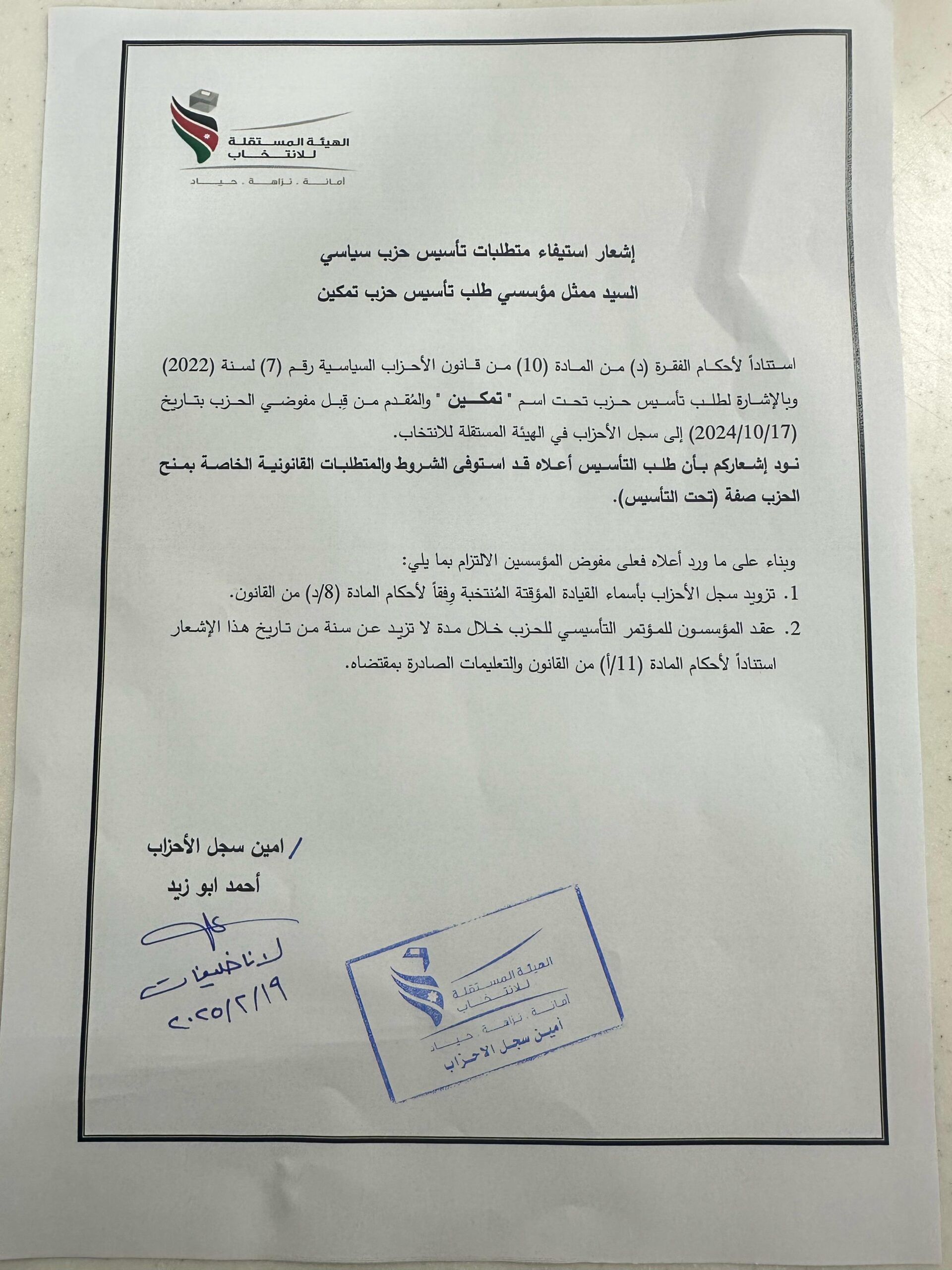 وأكدت الهيئة في الإشعار الذي وجهته للحزب ضرورة تزويد سجل الأحزاب بأسماء القيادة المؤقتة المنتخبة وفقا لأحكام المادة “8/د” من القانون، وأن يعقد المؤسسون المؤتمر التأسيسي للحزب خلال مدة لا تزيد عن سنة من تاريخ هذا الإشعار استنادا لأحكام المادة “11/أ” من القانون والتعليمات الصادرة بمقتضاه.