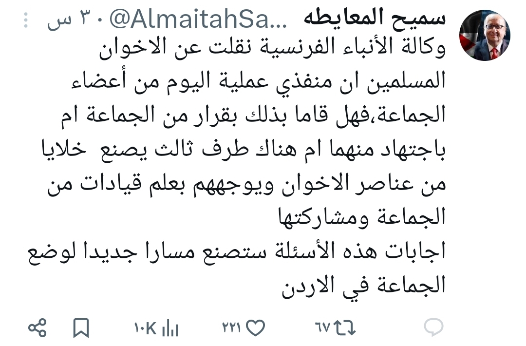 وقال المعايطة، في تغريدة على منصة اكس: وكالة الأنباء الفرنسية نقلت عن الاخوان المسلمين ان منفذي عملية اليوم من أعضاء الجماعة، فهل قاما بذلك بقرار من الجماعة ام باجتهاد منهما ام ان هناك طرفا ثالثا يصنع خلايا من عناصر الاخوان ويوجههم بعلم قيادات من الجماعة ومشاركتها.