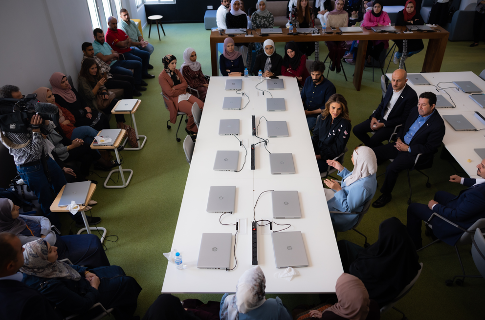 كما التقت جلالتها في قاعات التدريب الإضافية مجموعة من المتدربين المشاركين في دورة الأمن السيبراني، ومجموعة من الشباب ممن أنهوا دورات تدريبية مختلفة نظمها المركز تم تحديدها من قبل الخريجين أنفسهم وتهدف جميعها إلى تعزيز فرصهم في التوظيف.