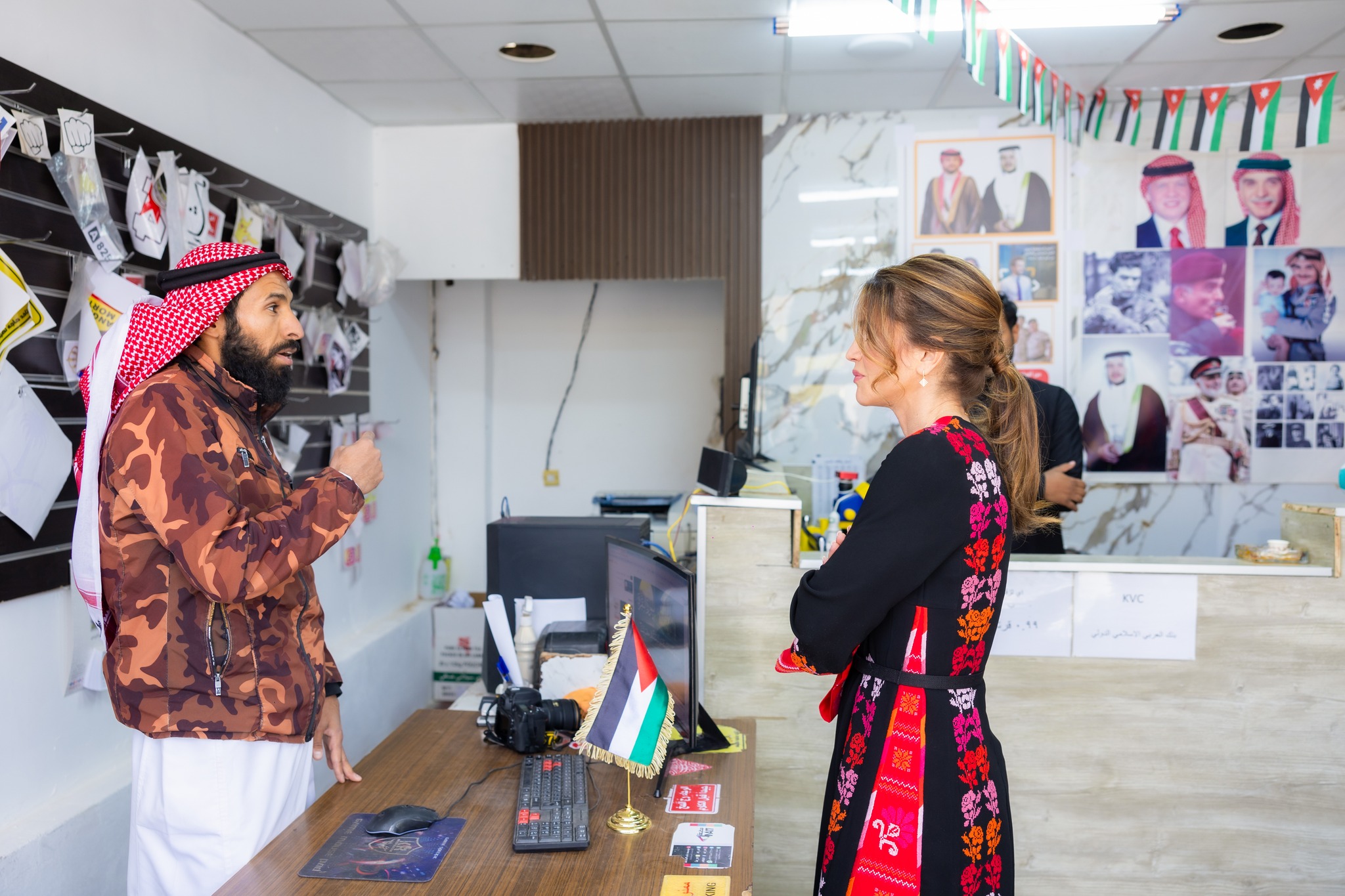 وفي بداية الزيارة، اطلعت جلالتها على المشروع المنزلي لحربة الركيبات لخبز الشراك وتنظيف السجاد والذي جرى دعمه لتوسيع خدماته، كما تفقدت مشروع علي المناجعة للطباعة والإعلانات، والذي ساهم في توفير فرص عمل لشباب المنطقة ويقدم خدمات الطباعة التجارية والإعلانات لأهالي المنطقة.