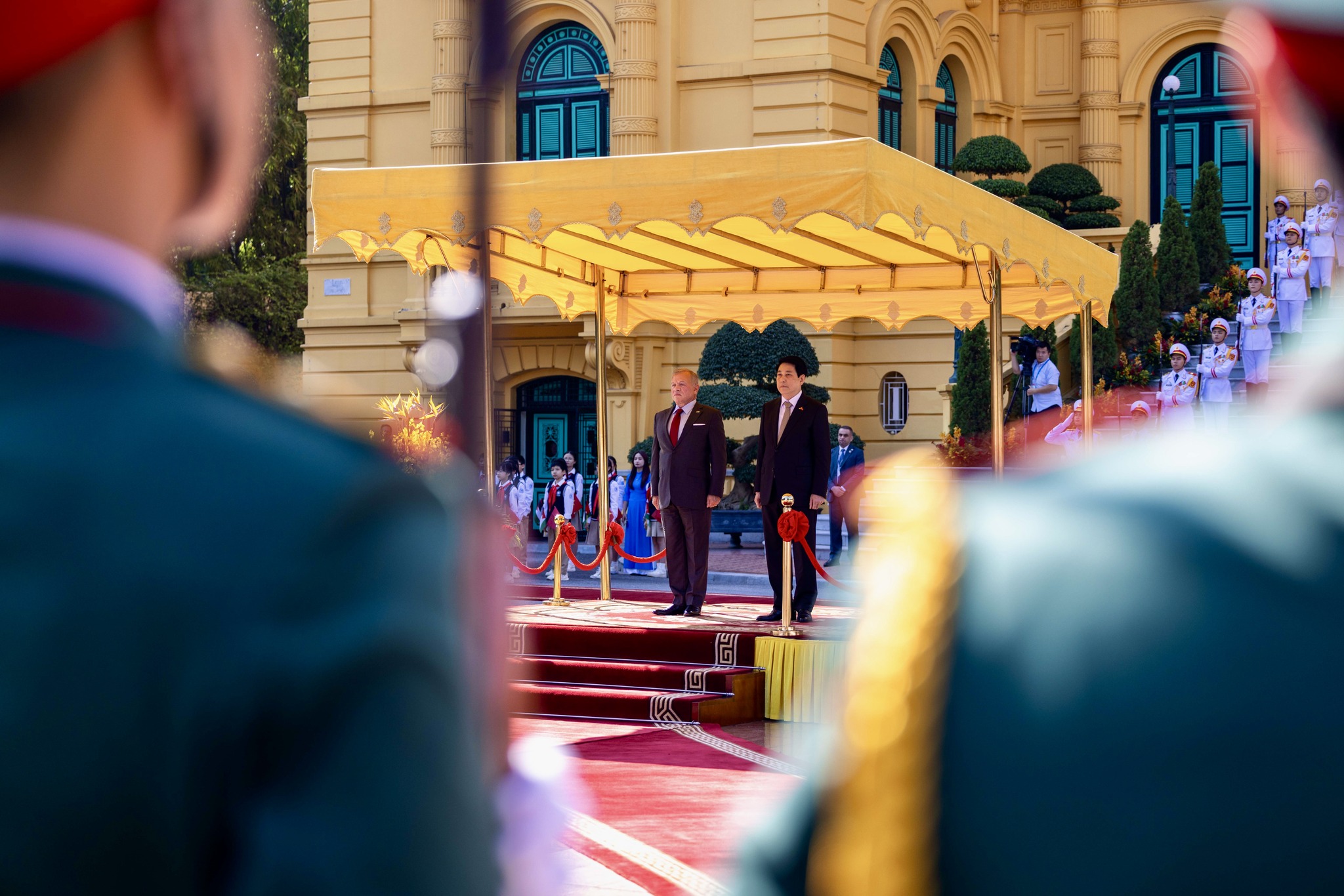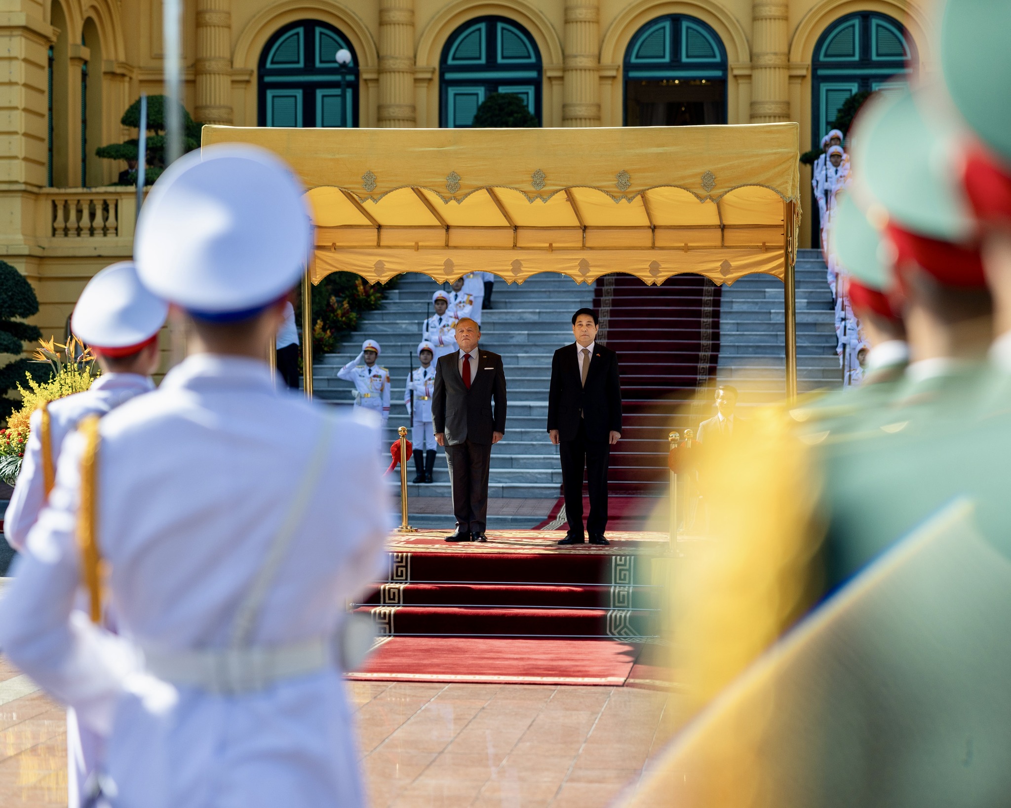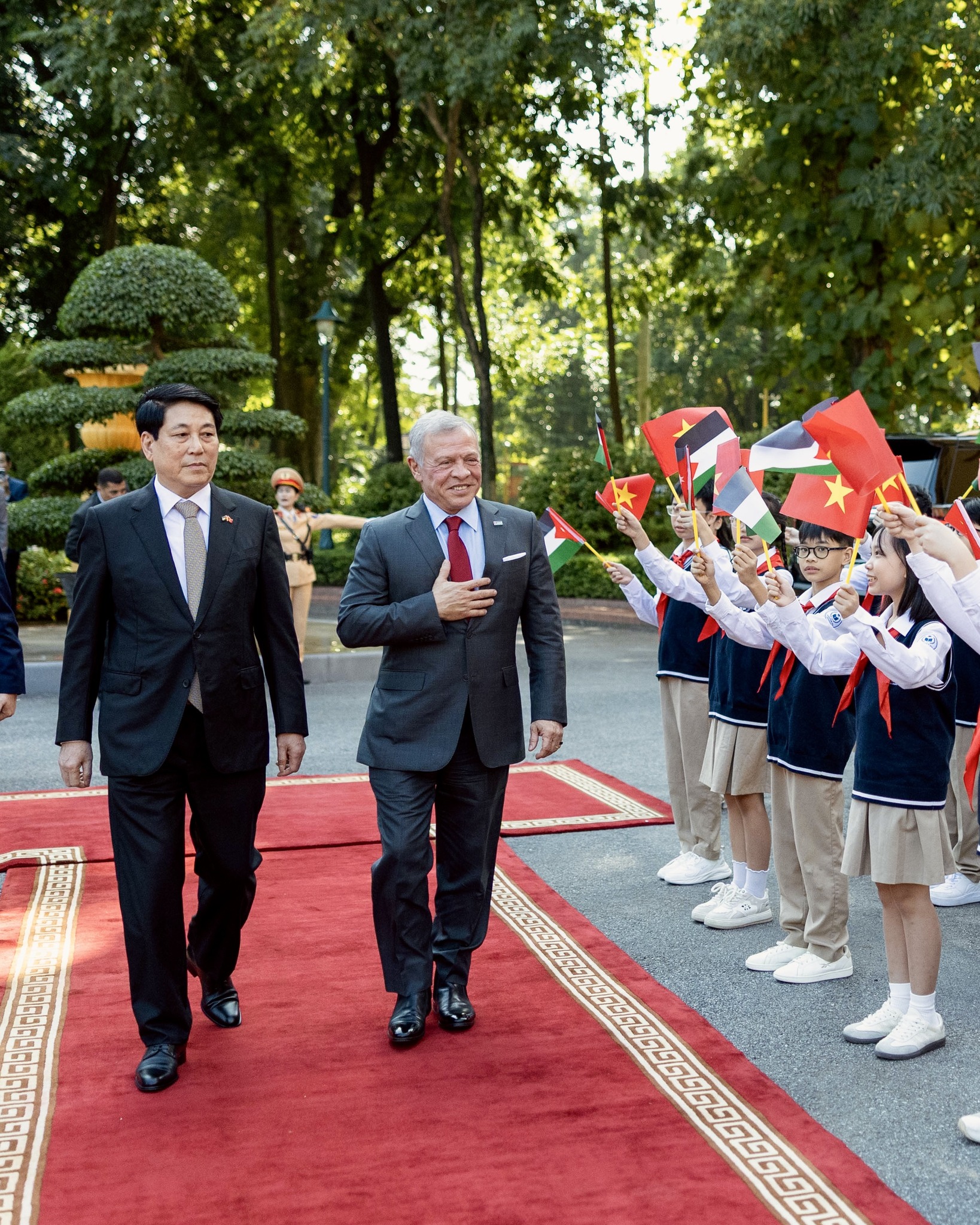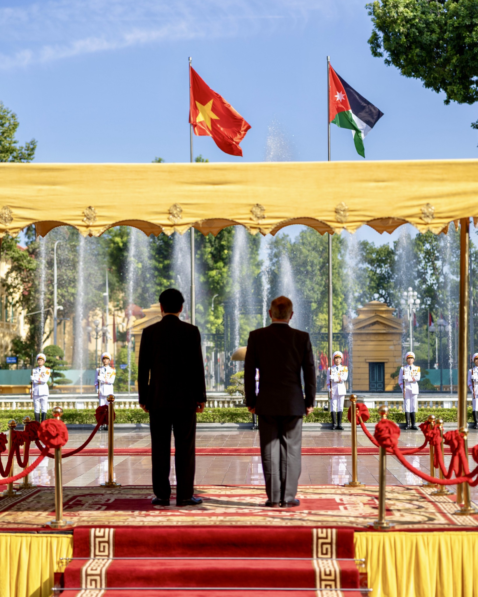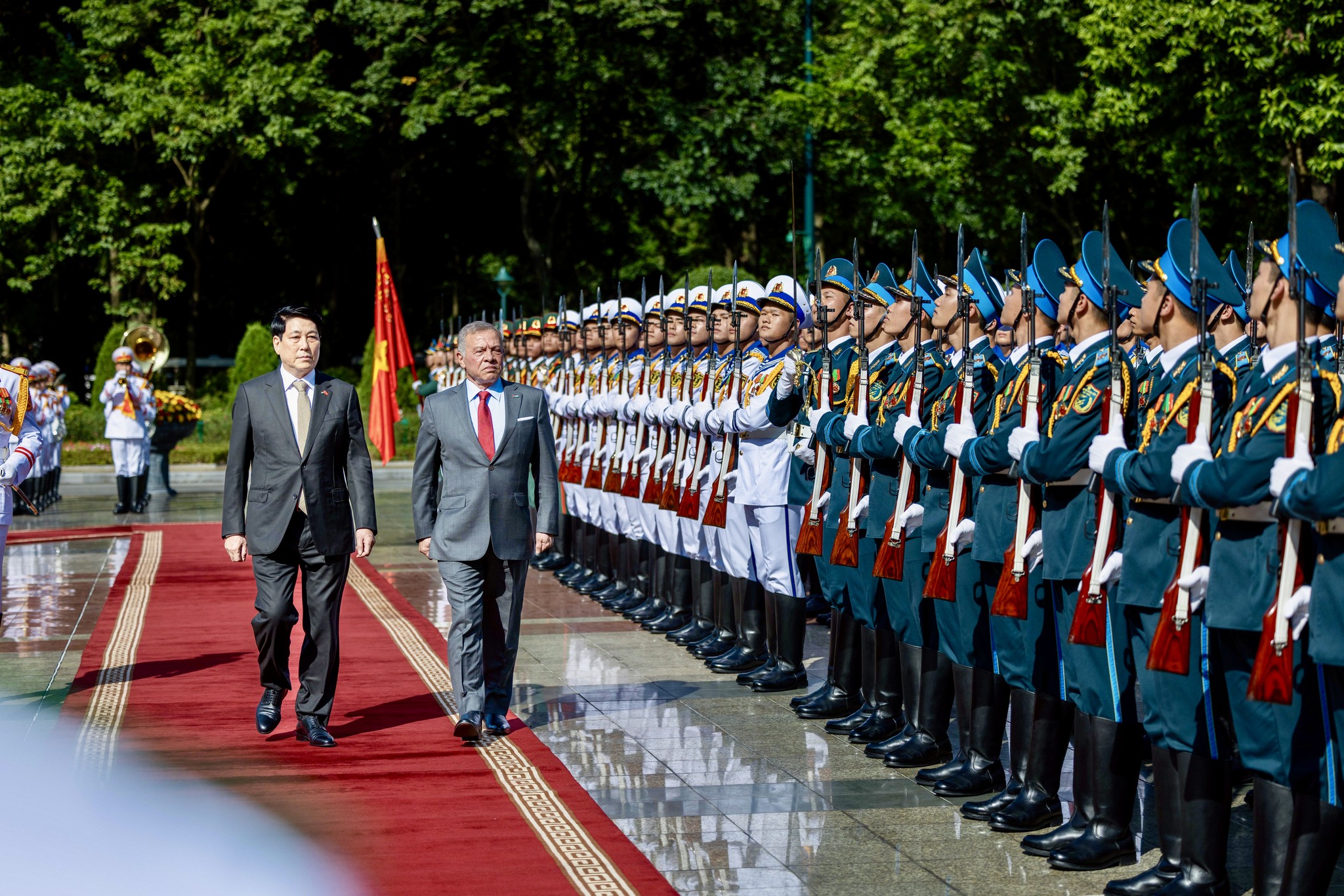 وأعرب جلالة الملك، خلال المباحثات عن اعتزازه بالعلاقات الأردنية الفيتنامية الممتدة لـنحو 45 عاما، مؤكدا الحرص على تطويرها ومأسسة التعاون في مختلف المجالات، بما في ذلك التعاون الاقتصادي والدفاعي.