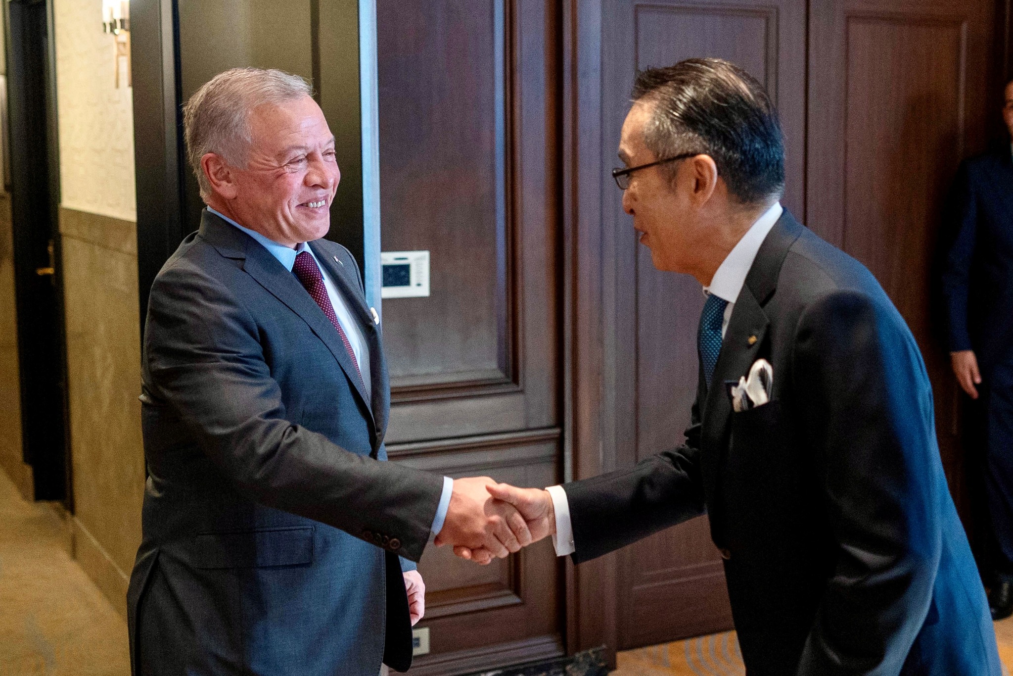وحضر الاجتماع نائب رئيس الوزراء ووزير الخارجية وشؤون المغتربين أيمن الصفدي، ومدير مكتب جلالة الملك، المهندس علاء البطاينة، ووزيرة التخطيط والتعاون الدولي زينة طوقان، والسفير الأردني لدى اليابان ناصر الشريدة، والسفير الياباني لدى الأردن أساري هيديكي.