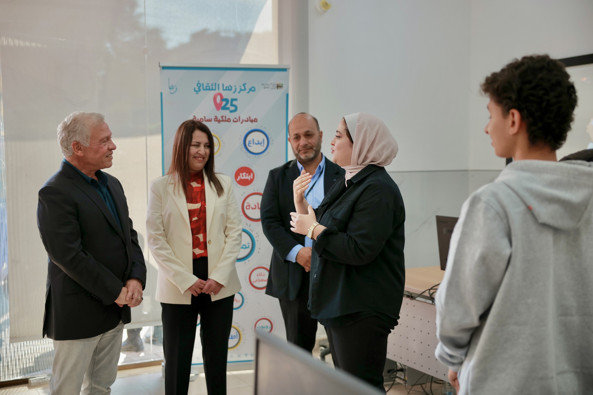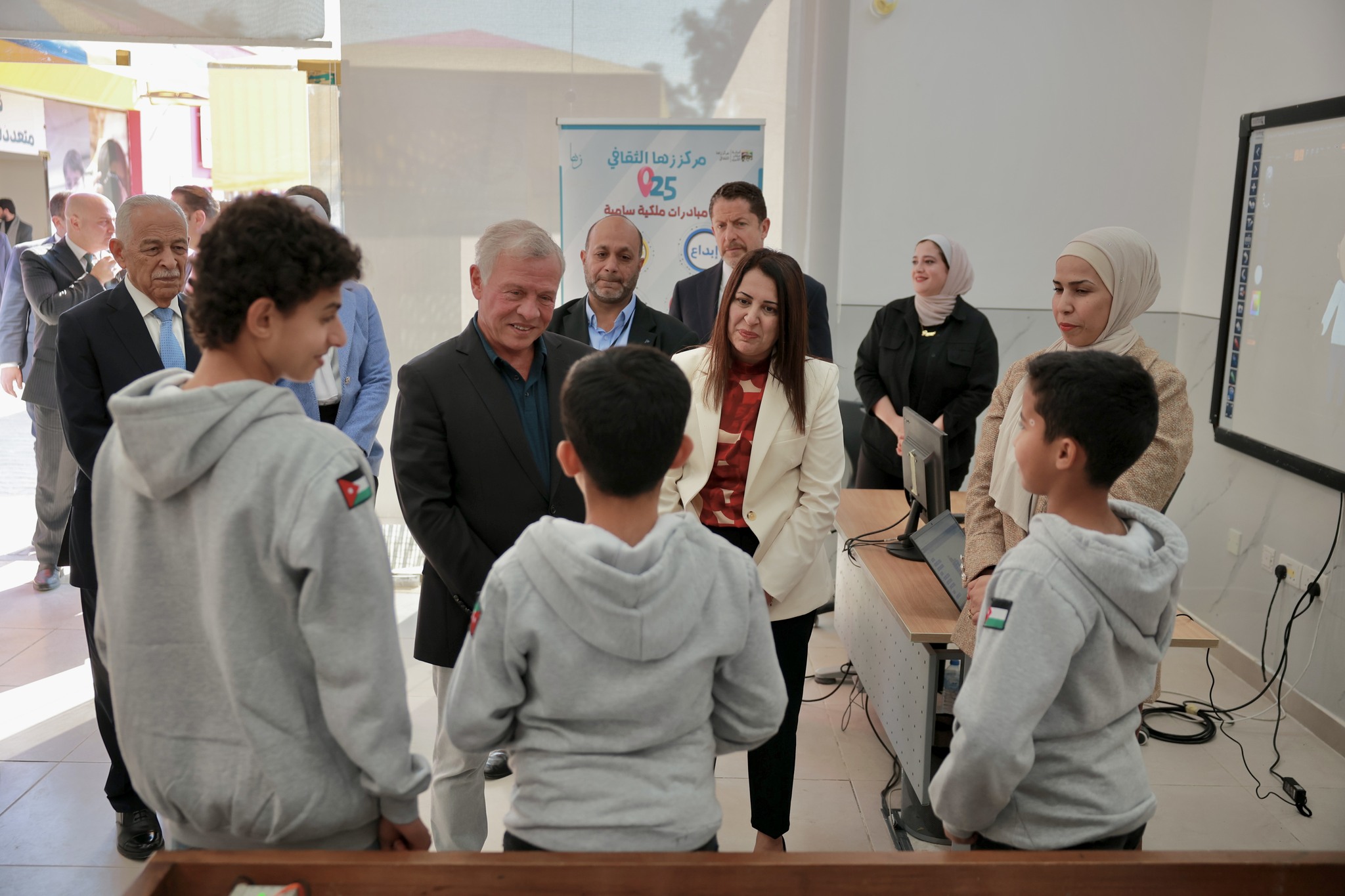 وفي إطار دعم جلالته ورعايته للأطفال واليافعين والسيدات في المجتمع المحلي، اطلع جلالة الملك على تجربة عدد من اليافعين خلال انخراطهم في برامج الروبوتات، والذكاء الاصطناعي والتصميم، في مركز زها الثقافي، الذي تم إنشاؤه ضمن مبادرة ملكية.