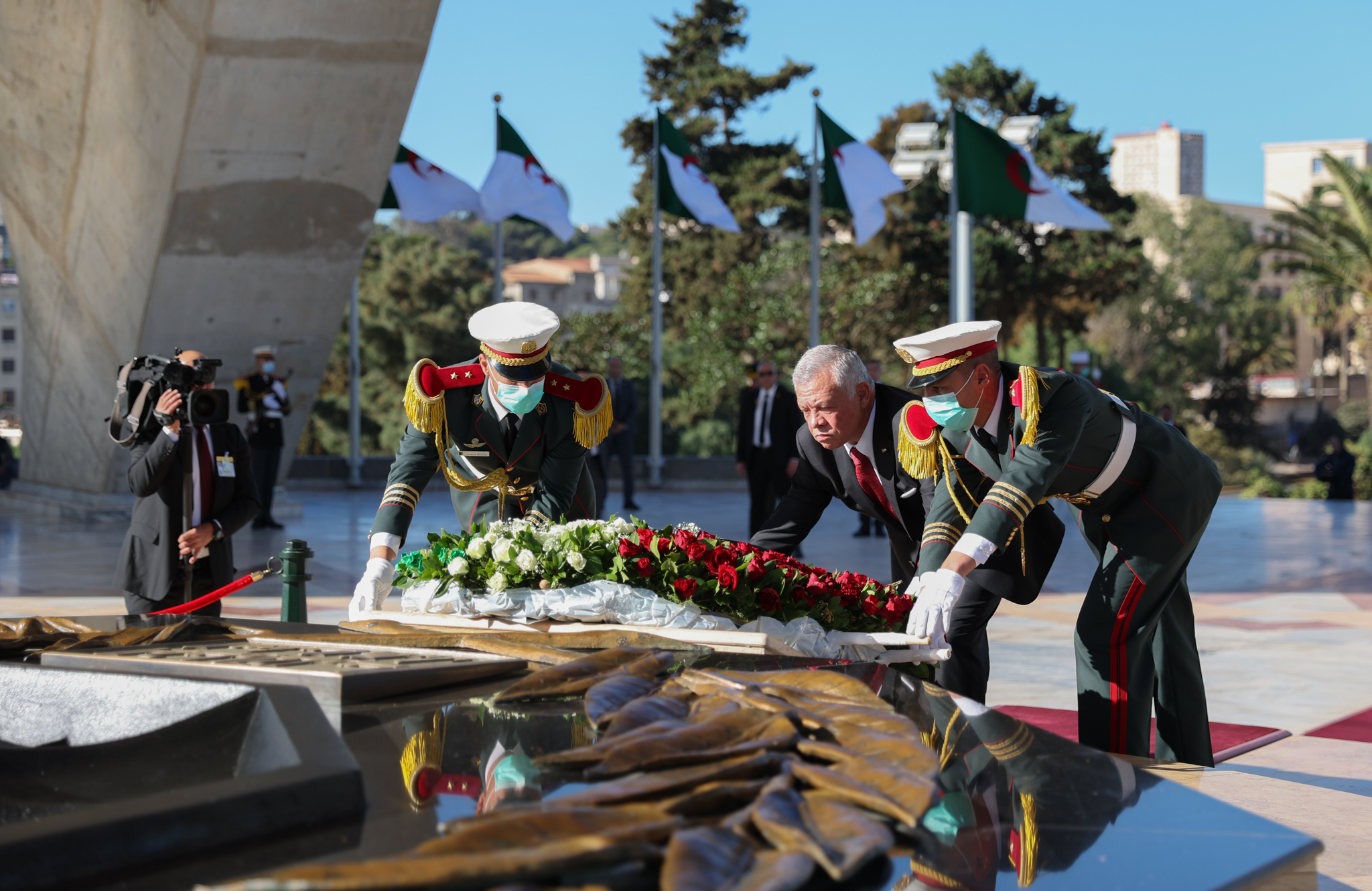 ووضع جلالته إكليلا من الزهور أمام النصب التذكاري في مقام الشهيد، وقرأ الفاتحة على أرواح شهداء الجزائر.