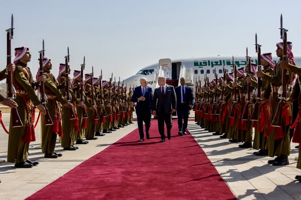 وكان في الاستقبال بمطار ماركا، نائب رئيس الوزراء ووزير الخارجية وشؤون المغتربين أيمن الصفدي، ومدير مكتب جلالة الملك، المهندس علاء البطاينة، ووزير الصناعة والتجارة والتموين يعرب القضاة، رئيس بعثة الشرف المرافقة للضيف، ورئيس لجنة أمانة عمان الكبرى الدكتور يوسف الشواربة، ومحافظ العاصمة ياسر العدوان، وسفير العراق لدى الأردن عمر البرزنجي.
