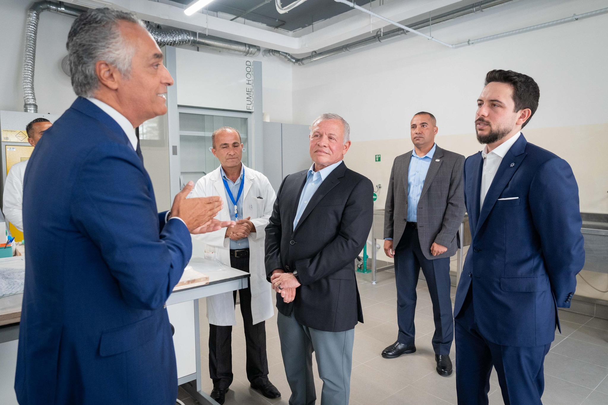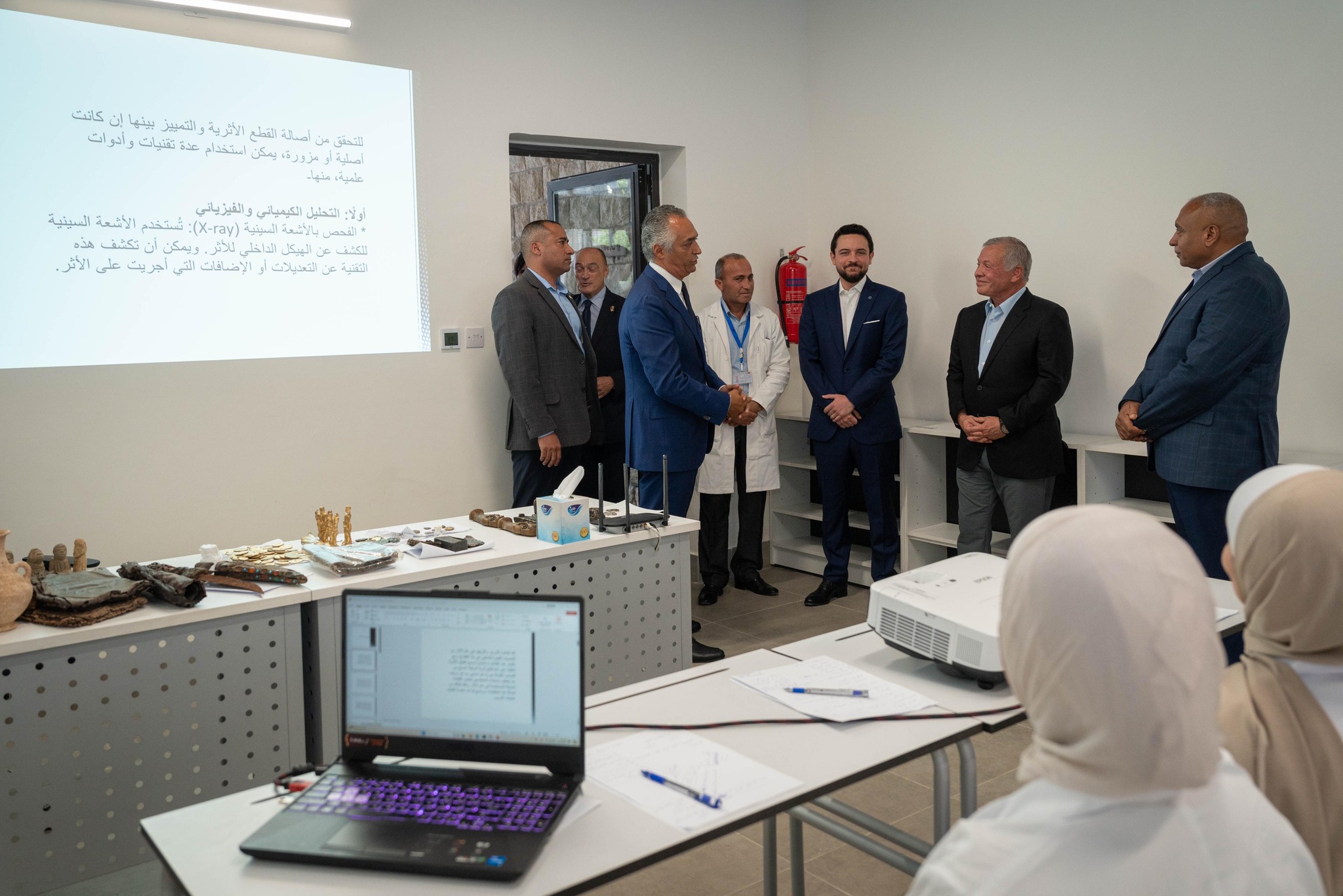 كما استمع جلالته إلى شرح قدمه المساعد الفني لمدير المركز بلال البوريني حول العلوم والتجارب التي يكتسبها المتدربون في مختبر الكيمياء، ومختبر التوثيق، وغرفة تنظيف القطع الأثرية بالليزر، ومشغل التطبيق العملي.