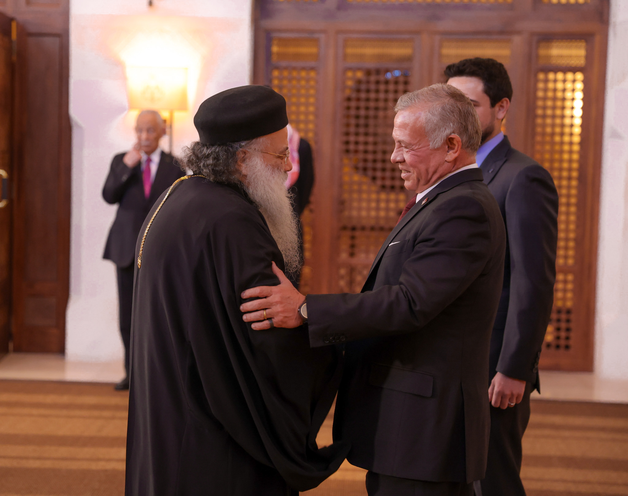 وحضر اللقاء رئيس الديوان الملكي الهاشمي يوسف حسن العيسوي، ونائب رئيس الوزراء ووزير الخارجية وشؤون المغتربين أيمن الصفدي، ومدير مكتب جلالة الملك، المهندس علاء البطاينة، ووزير الأوقاف والشؤون والمقدسات الإسلامية الدكتور محمد الخلايلة، ورئيس الهيئة الرئاسية العليا لشؤون الكنائس في دولة فلسطين الدكتور رمزي خوري.