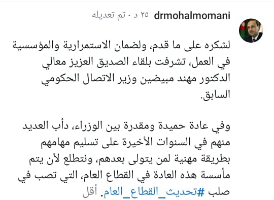 المستقل – رصد – نشر وزير الاتِّصال والناطق الرسمي بإسم الحكومة الدكتور محمَّد المومني منشورا وصورة جمعته بوزير الاتصال الحكومي السابق الدكتور مهند المبيضين عبر موقع التواصل الإجتماعي “إنستغرام”، تضمن شكر وتقدير للمبيضين على جهوده السابقة وعلى مبادرته في تسليم مهامه بطريقة مهنية تسهم في تطوير مفهوم تحديث القطاع العام.