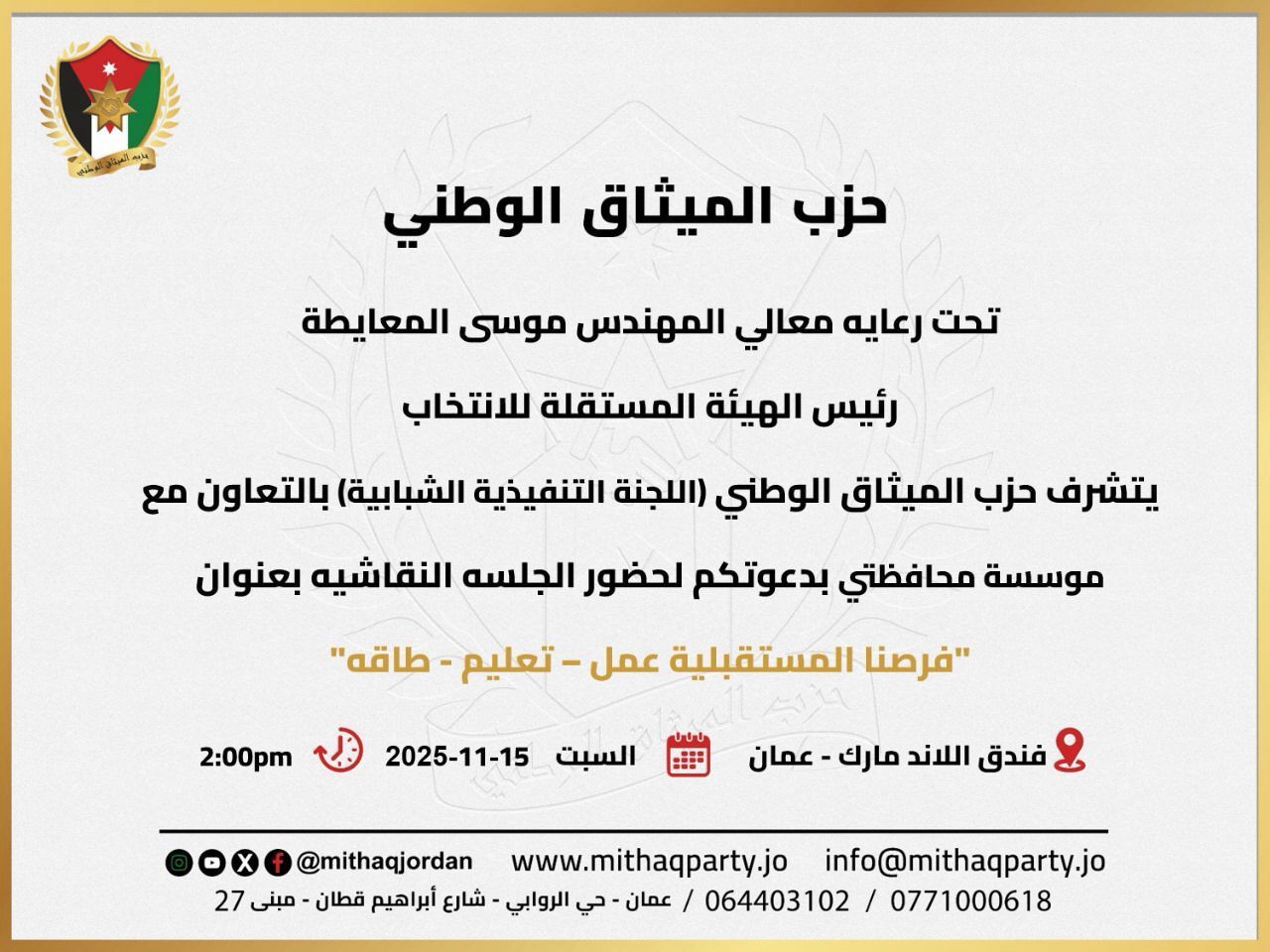 المستقل – تقيم اللجنة التنفيذية الشبابية في حزب الميثاق الوطني بالتعاون مع مؤسسة محافظتي جلسة نقاشية بعنوان ” فرصنا المستقبلية عمل – تعليم – طاقة ” ، وذلك في تمام الساعة الثانية من يوم السبت القادم الموافق 15\11\2025 في فندق اللاند مارك – عمان .