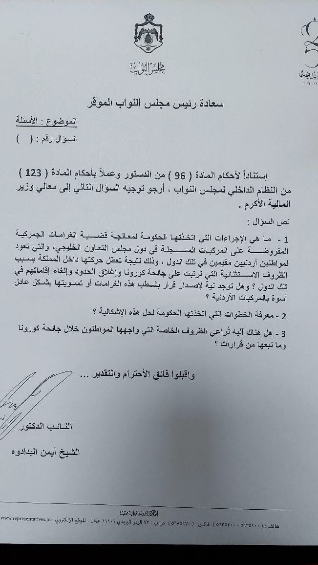 وجه النائب الدكتور الشيخ ايمن البدادوه سؤالًا نيابيًا لوزير المالية حول الإجراءات التي اتخذتها الحكومة لمعالجة قضية الغرامات الجمركيةالمفروضة على المركبات المسجلة في دول مجلس التعاون الخليجي والتي تعود لمواطنين أردنيين مقيمين في تلك الدول .
