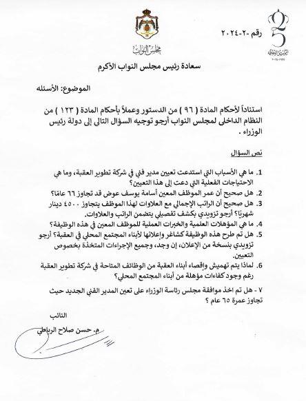 وجه النائب المهندس حسن الرياطي، سؤالًا نيابيًا إلى رئيس الوزراء الدكتور جعفر حسان ، حول أسباب تعيين مدير فني في شركة تطوير العقبة يبلغ من العمر 66 عامًا.