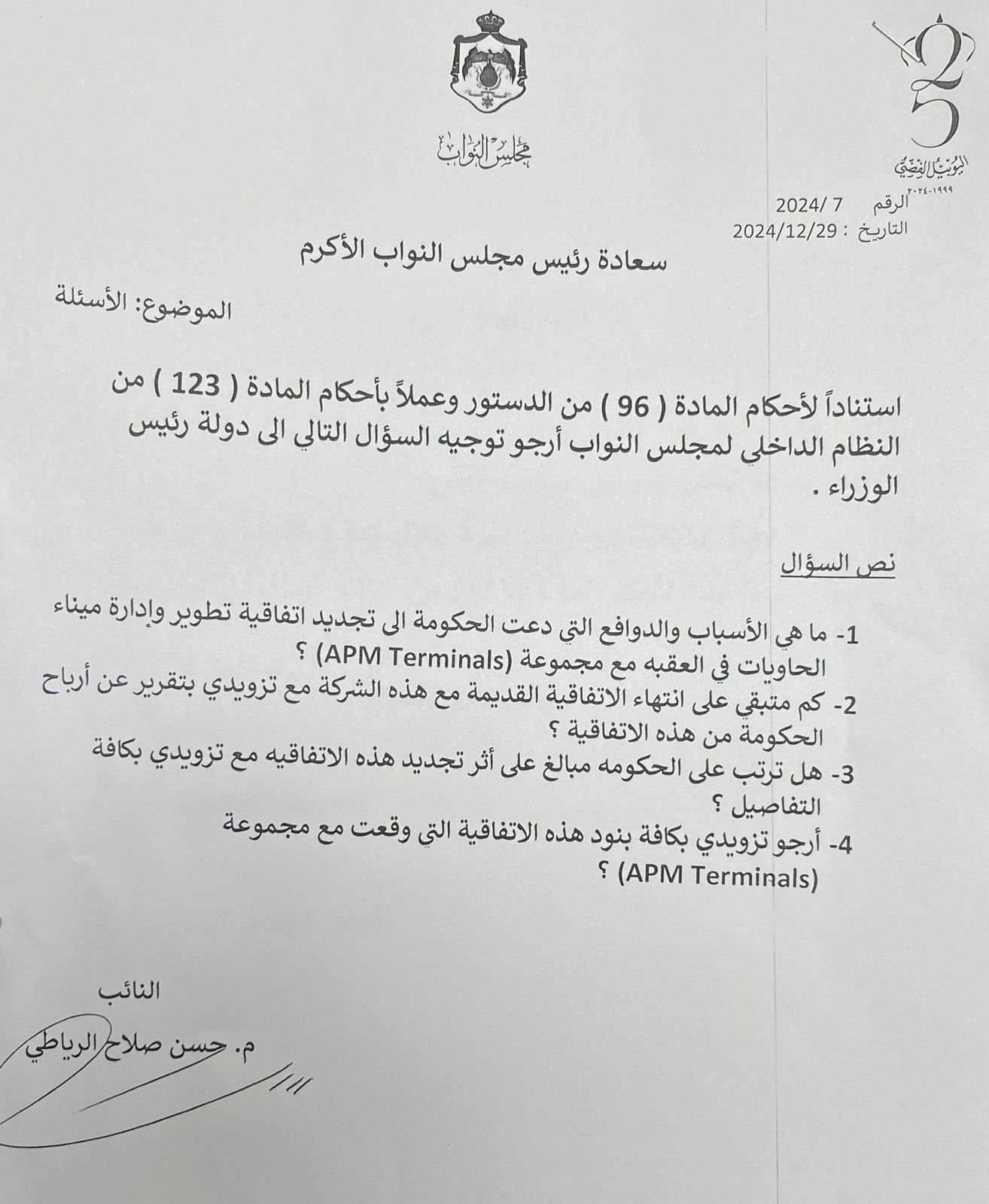 وجه النائب عن حزب جبهة العمل الإسلامي المهندس حسن الرياطي سؤالا نيابيا للحكومة حول إدارة ميناء الحاويات في العقبة.