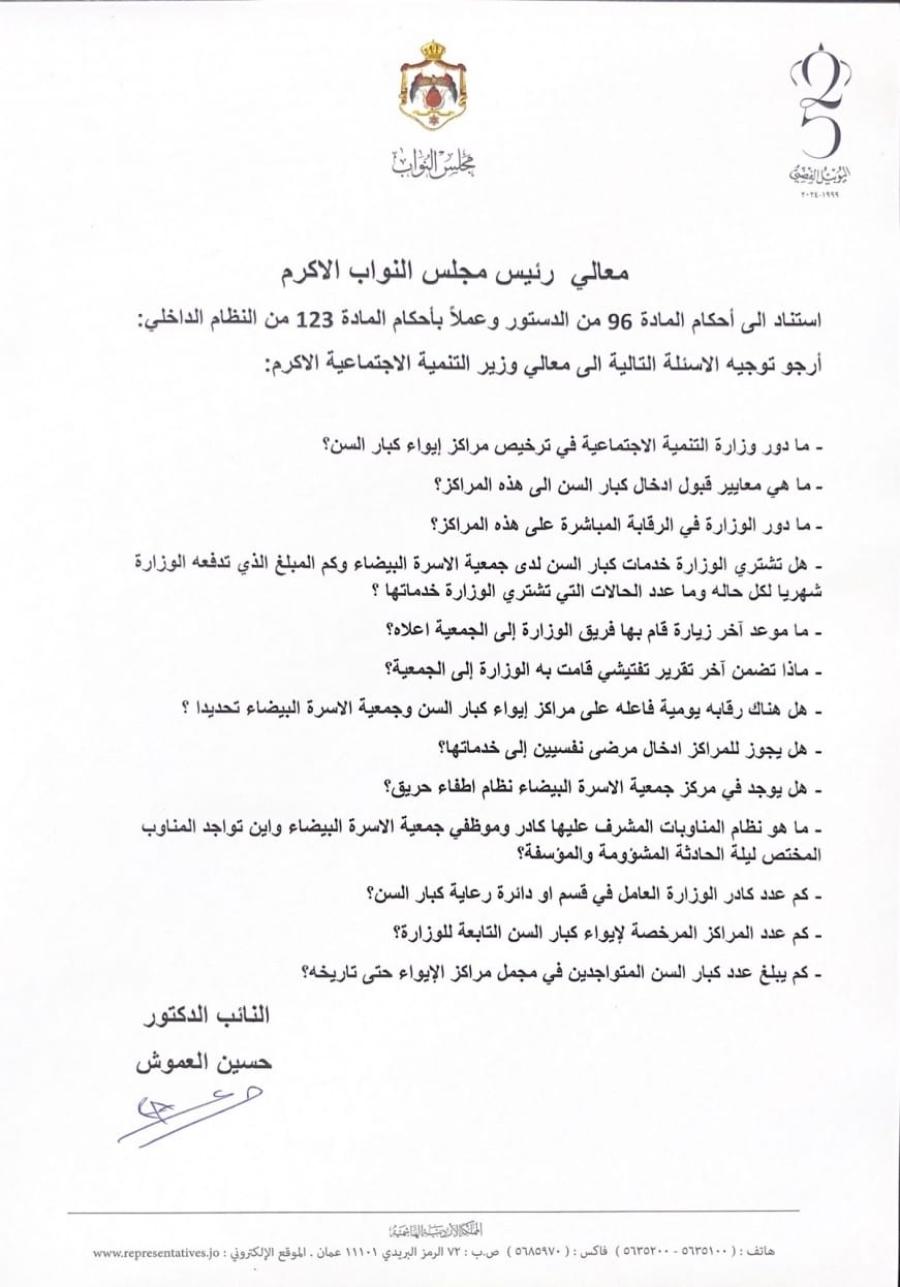 وجه النائب حسين العموش سؤالا نيابيا الى وزيرة التنمية الاجتماعية الدكتورة وفاء بني مصطفى، يطلب فيه الإجابة عن استفسارات تتعلق بحريق دار ضيافة المسنين في العاصمة عمان.