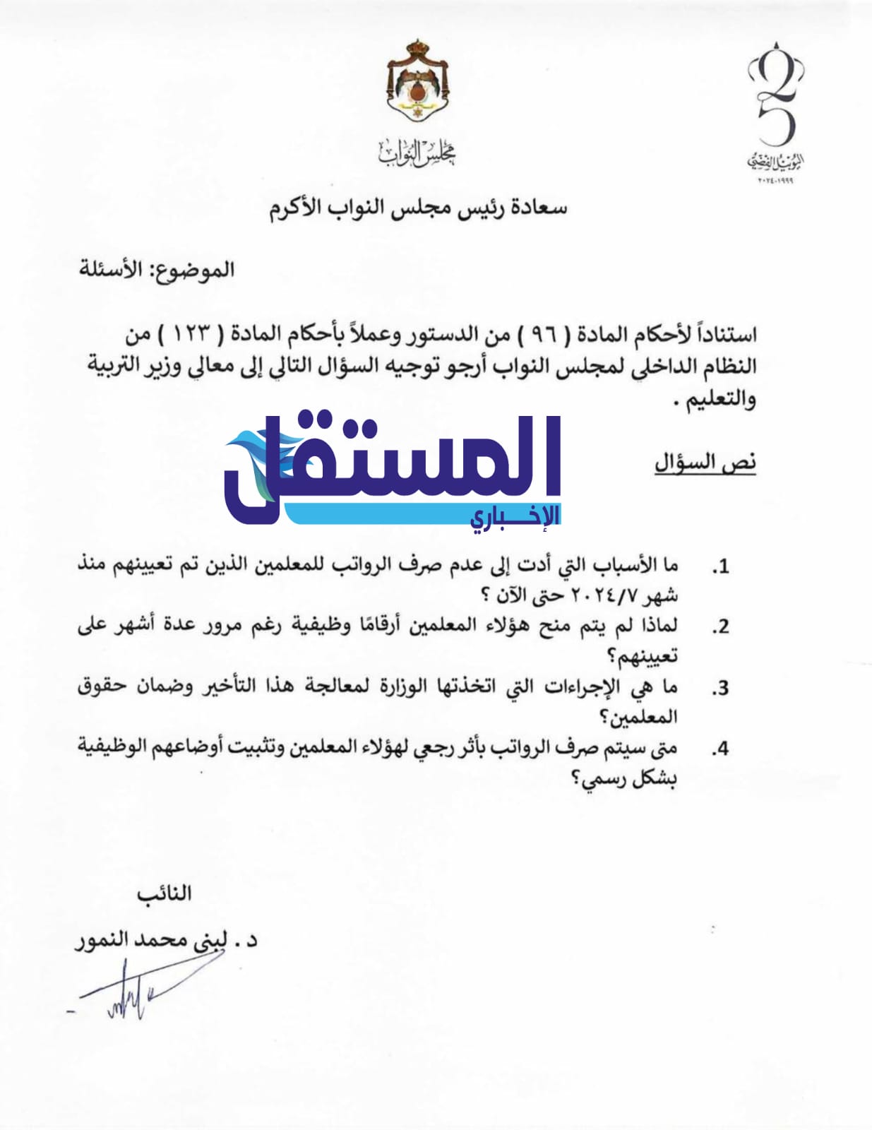 وجهت النائب لبنى محمد النمور سؤالا نيابيا إلى وزير التربية والتعليم، احتوى على عدد من المحاور حول المعلمين الذين تم تعيينهم منذ شهر 7/2024.