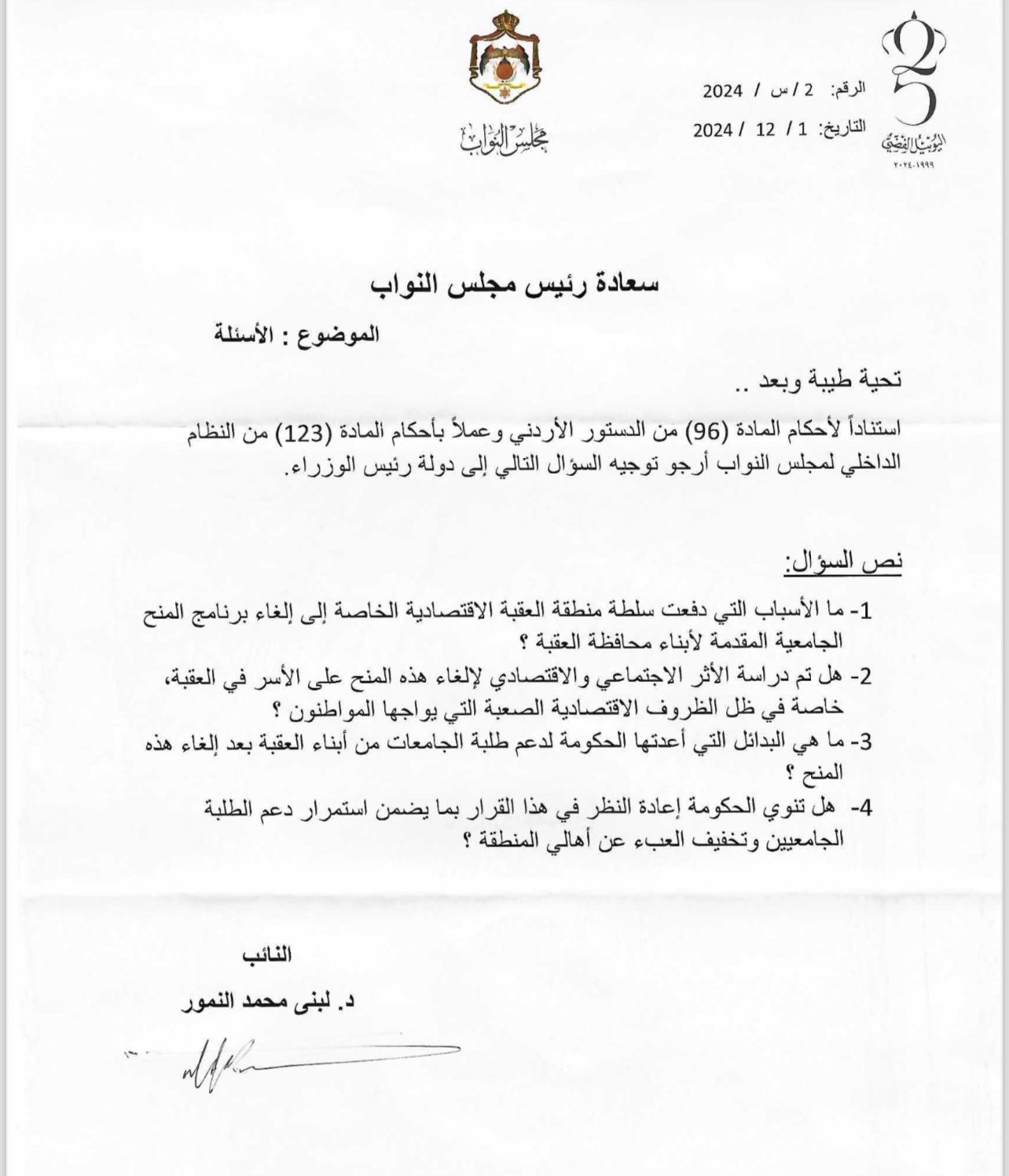 المستقل – محرر الشؤون البرلمانية – استناداً لأحكام المادة (96) من الدستور الأردني وعملاً بأحكام المادة (123) من النظام الداخلي لمجلس النواب أرجو توجيه السؤال التالي إلى دولة رئيس الوزراء.