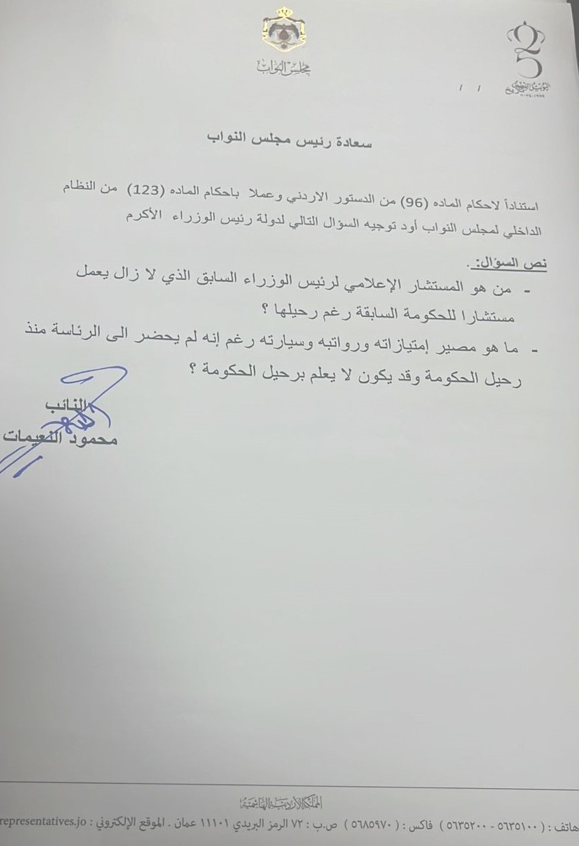 وجه النائب محمود النعيمات سؤالا نيابيا إلى رئيس الوزراء الحالي جعفر حسان، حول المستشار الإعلامي السابق لرئيس الوزراء الذي لا زال يعمل مستشارا للحكومة السابقة رغم رحيلها.