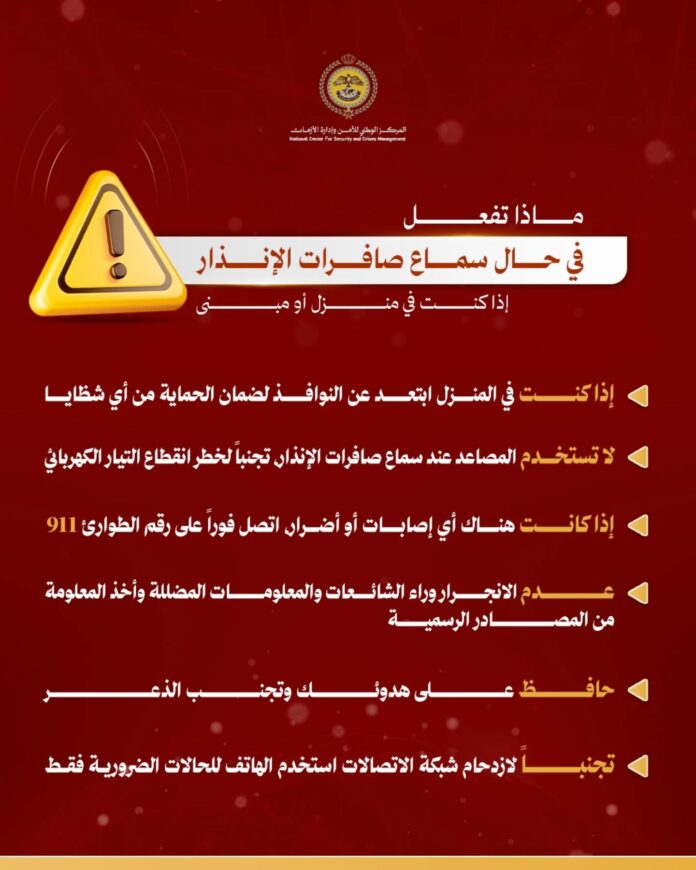 “الوطني لإدارة الأزمات” يصدر إرشادات للتعامل مع صافرات الإنذار وسقوط أجسام من الجو