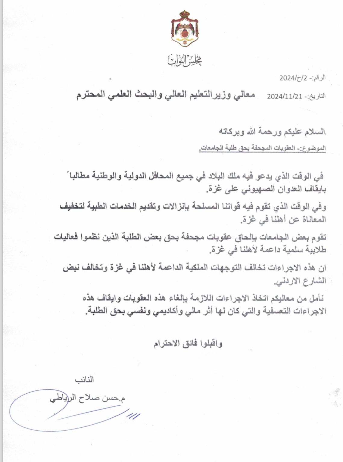 المستقل – محرر الشؤون البرلمانية – وجه النائب عن جبهة العمل الإسلامي حسن الرياطي كتابا لوزير التعليم العالي والبحث العلمي عزمي المحافظة، مطالبا فيه اتخاذ الاجراءات اللازمة بإلغاء العقوبات بحق الطلبة الذين نظموا فعاليات طلابية سلمية داعمة لأهلنا في غزة، وايقاف هذه الاجراءات التعسفية والتي كان لها أثر مالي وأكاديمي ونفسي بحقهم.