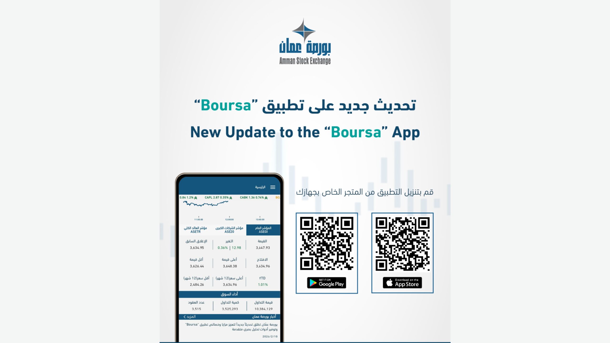 ودعت البورصة المستثمرين والمتابعين والمهتمين بسوق رأس المال الوطني إلى تحديث تطبيق Boursa عبر متجري App Store و Google Play، والاستفادة من تجربة رقمية متطورة تتيح متابعة لحظية دقيقة للسوق ضمن واجهة استخدام حديثة وسهلة وغنية بالبيانات والإحصائيات.
