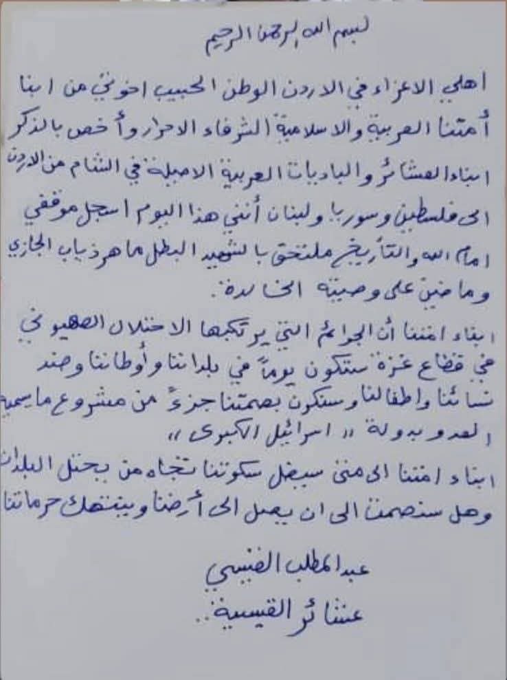 وجاء في الوصية التي خطها بيده، توجيه تحية إلى “الأردن الوطن العزيز، وإلى أبناء الأمة العربية والإسلامية الشرفاء”، مؤكداً أن موقفه يأتي امتداداً لتاريخ طويل من التضحيات من فلسطين وسوريا ولبنان. كما خصّ بالذكر الشهيد ماهر ذياب الجازي.