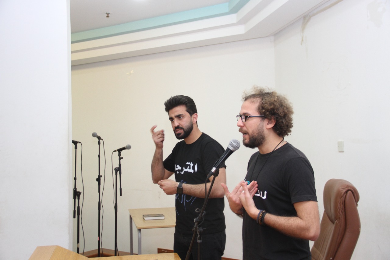 وتحدث في  المحاضرة السيد هاشم قلعجي  مؤسس منظمة سامعك يرافقه الطالب محمود هديب ترجمة للغة الاشارة  عن نشأة منظمة سامعك ومساهمتها في متابعة شؤون  أفراد المجتمع من ذوي الاحتياجات الخاصة  وعن تجربته الشخصية في موضوع الصم والبكم على وجه التحديد.