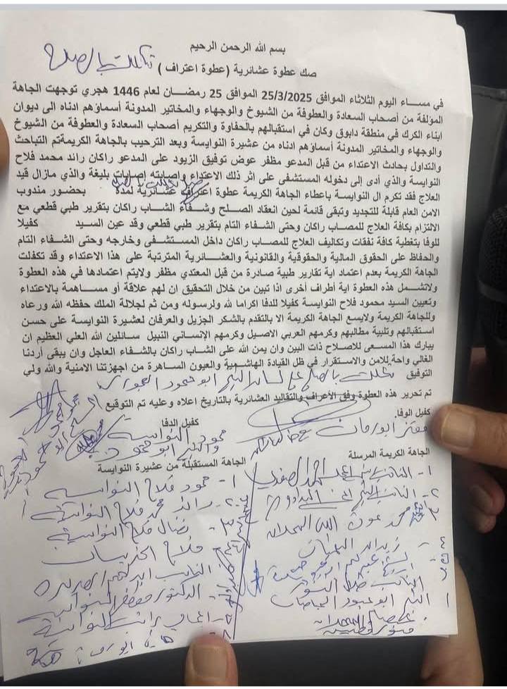 واعلن عن منح عشيرة النوايسة عطوفة اعتراف مشروطة بخروج الشاب راكان من المستشفى ليصار الى المباشرة باجراءات الافراج عن الشاب المعتدي، معرباً عن تقديره لقدوم الجاهة الى عشيرة النوايسة في ديوان ابناء الكرك.