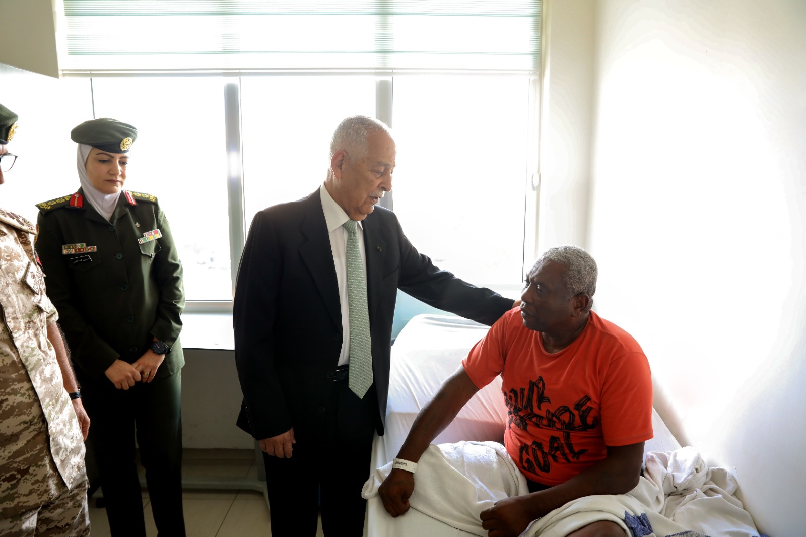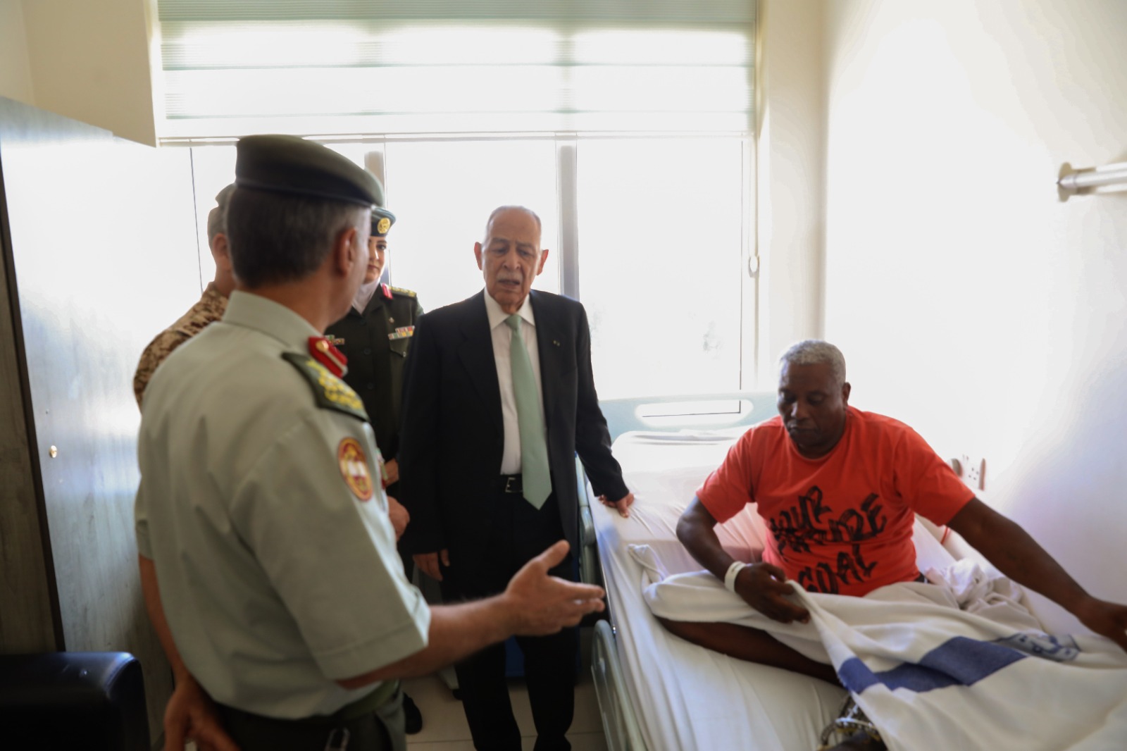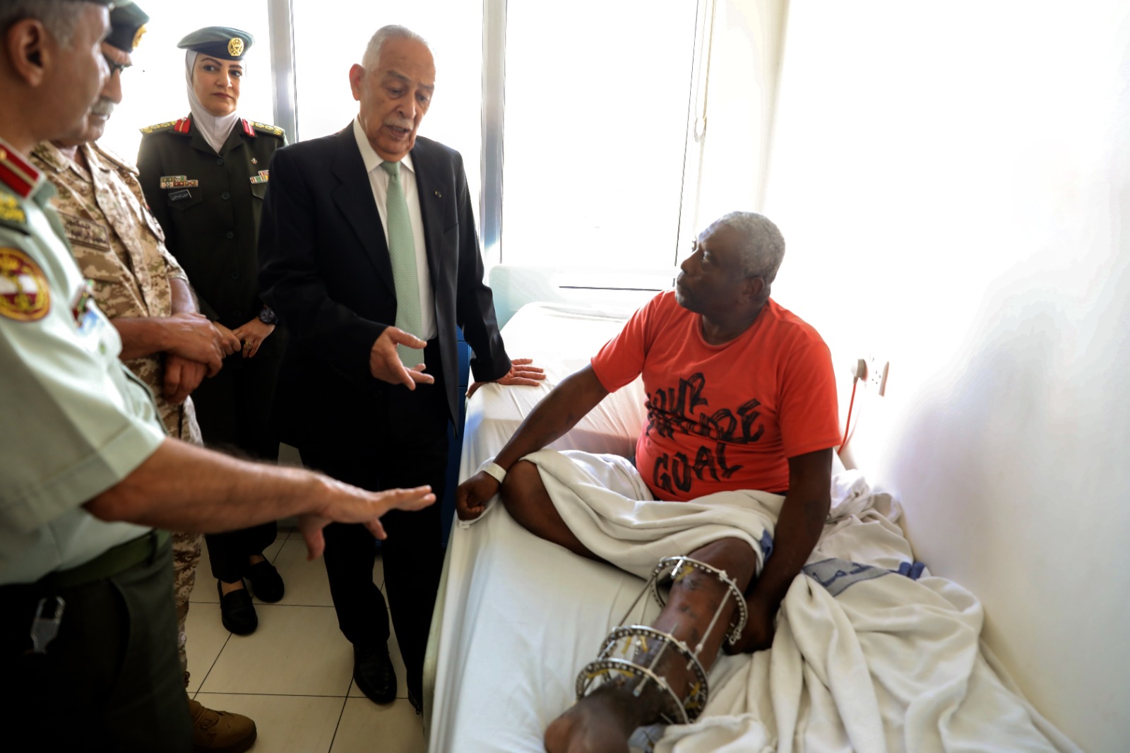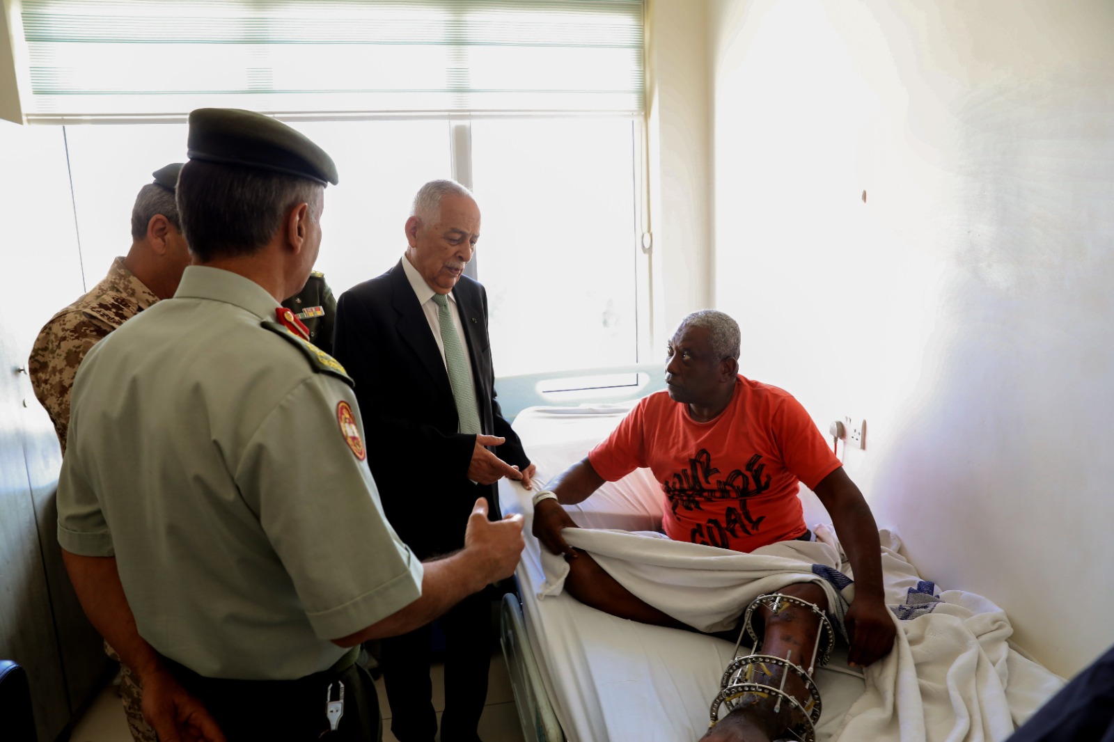 كما زار العيسوي المواطن وصفي نمر الفريحات، الذي نُقل للعلاج في الخدمات الطبية الملكية بتوجيهات ملكية سامية، بعد تعرضه لكسر في قدمه، ناقلاً لهما تمنيات جلالة الملك عبدالله الثاني وسمو الأمير الحسين بن عبدالله الثاني، ولي العهد، بموفور الصحة والعافية والشفاء العاجل.