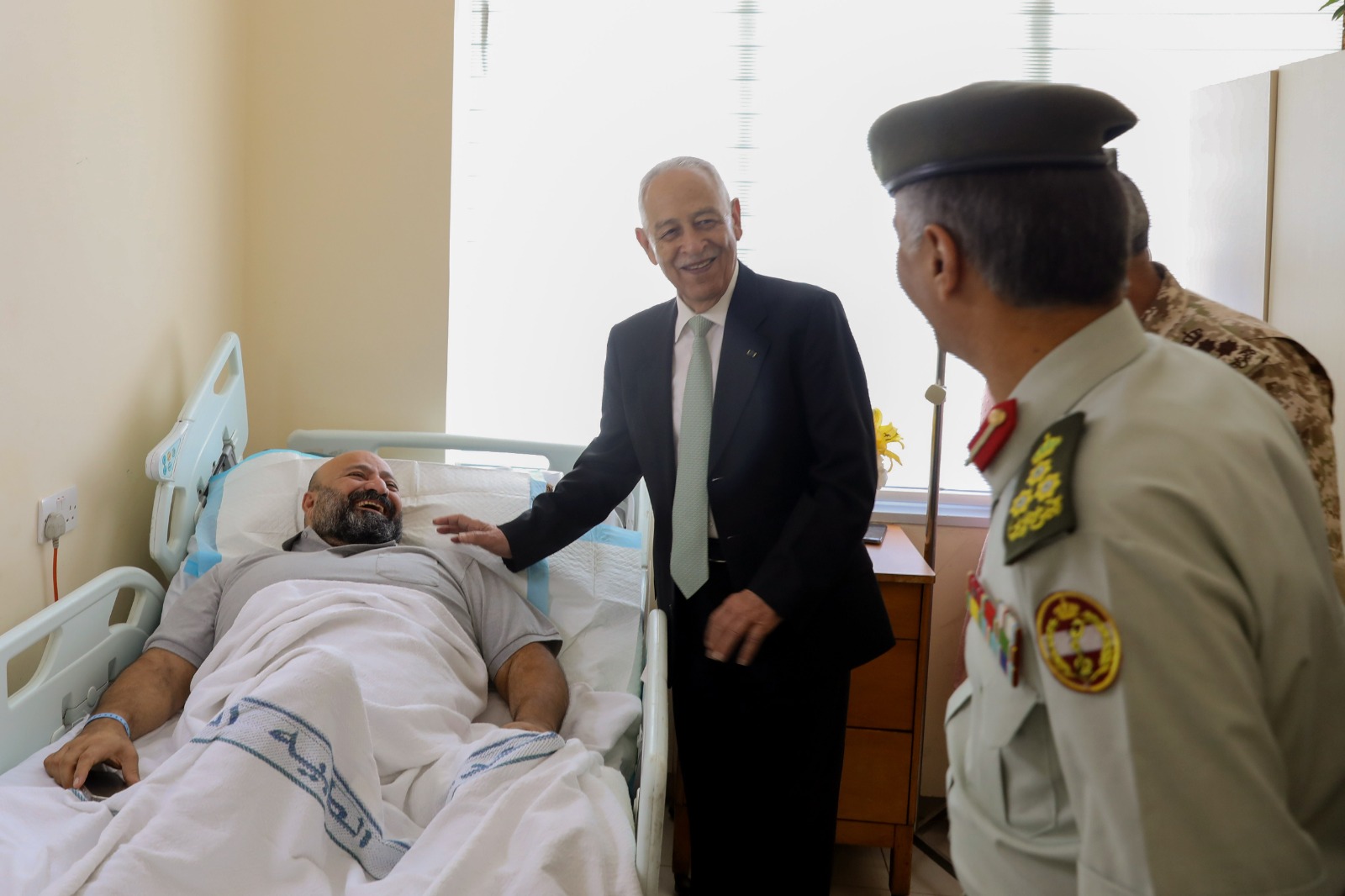 كما زار العيسوي المواطن وصفي نمر الفريحات، الذي نُقل للعلاج في الخدمات الطبية الملكية بتوجيهات ملكية سامية، بعد تعرضه لكسر في قدمه، ناقلاً لهما تمنيات جلالة الملك عبدالله الثاني وسمو الأمير الحسين بن عبدالله الثاني، ولي العهد، بموفور الصحة والعافية والشفاء العاجل.