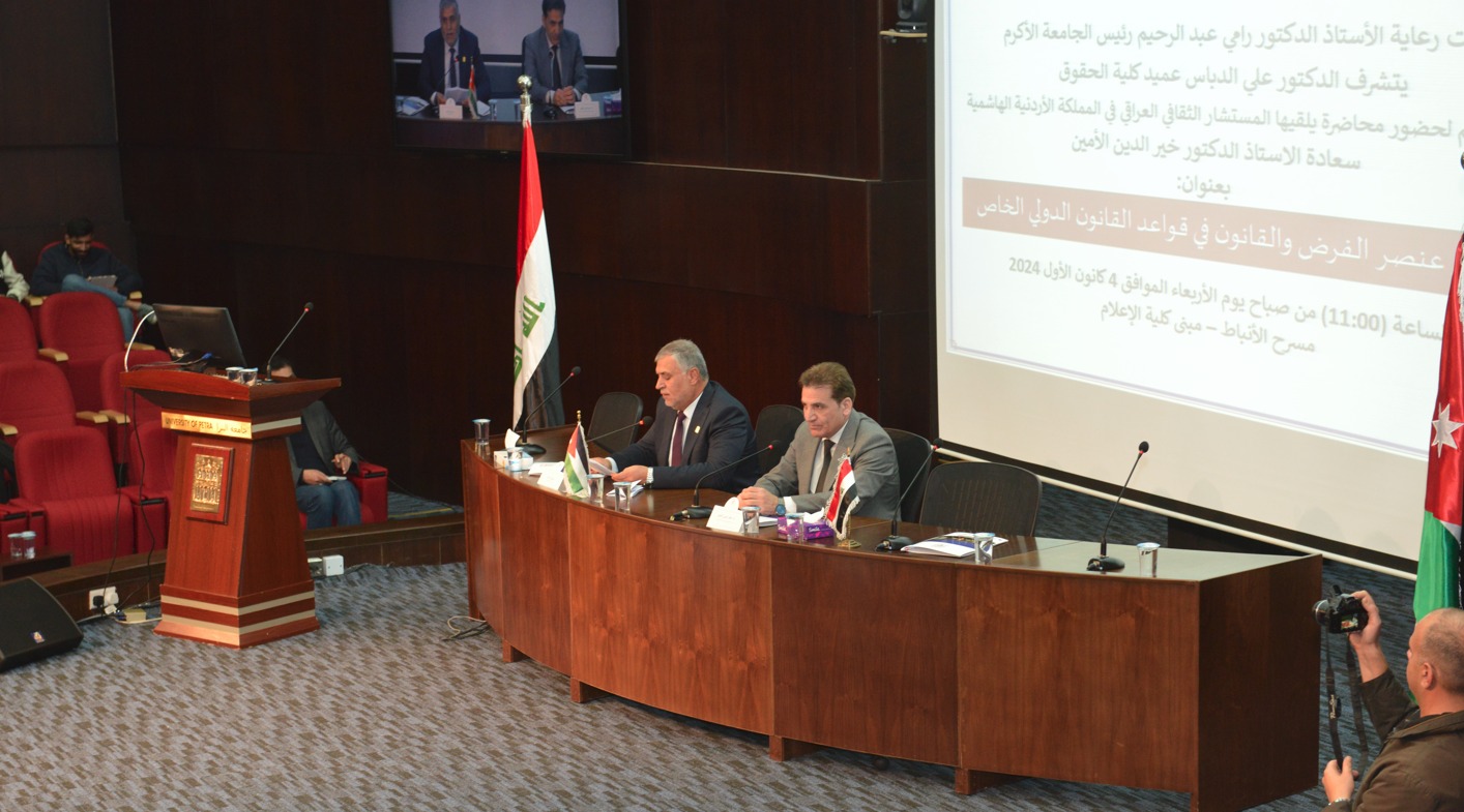 المستقل – استضافت كلية الحقوق في جامعة البترا محاضرة للمستشار الثقافي لجمهورية العراق في المملكة الأردنية الهاشمية الأستاذ الدكتور خير الدين الأمين، بعنوان: “تطور عنصر الفرض والقانون في قواعد القانون الدولي الخاص” على مسرح الأنباط في كلية الإعلام، حضرها رئيس الجامعة الأستاذ الدكتور رامي عبد الرحيم، وعدد من العمداء، ومديري الدوائر الإدارية، وطلبة الجامعة.