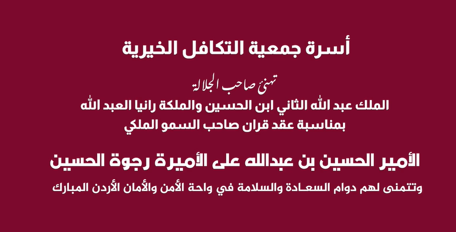 المستقل – تتقدم اسرة جمعية التكافل الخيرية بأسمى آيات التهاني والتبريكات الى صاحبي الجلالة الملك عبدالله الثاني بن الحسين المعظم حفظه الله ورعاه وجلالة الملكة رانيا العبدالله بمناسبة زفاف صاحب السمو الملكي ولي العهد الامير حسين بن عبدالله على الاميرة رجوه آل سيف .