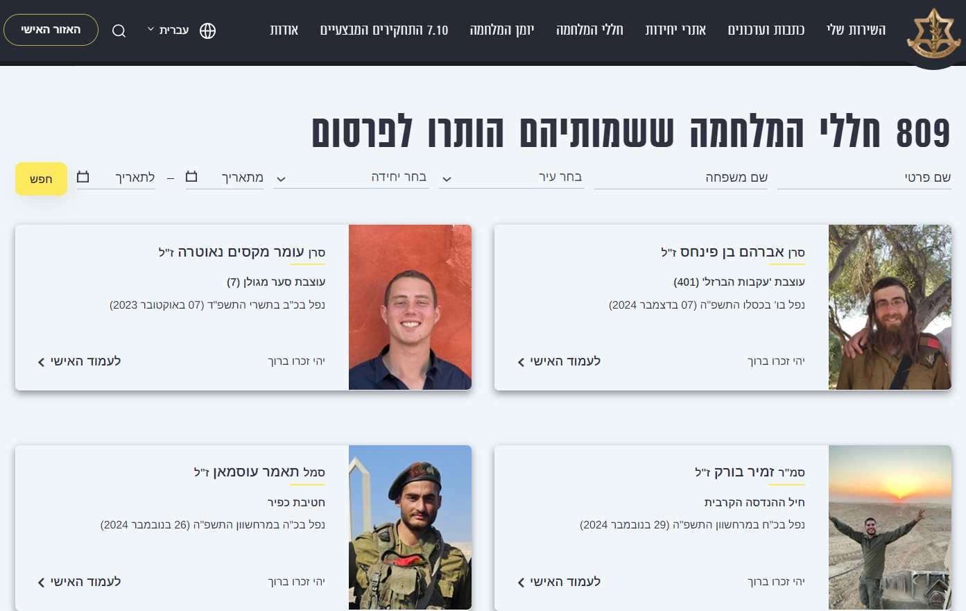 وفي آخر تحديث لبياناته على موقعه الرسمي، كشف الجيش الإسرائيلي أن عدد القتلى في صفوفه بلغ منذ السابع من أكتوبر (2023) وخلال الغزو البري لغزة ولبنان 809 عسكريين، بين ضباط وجنود.